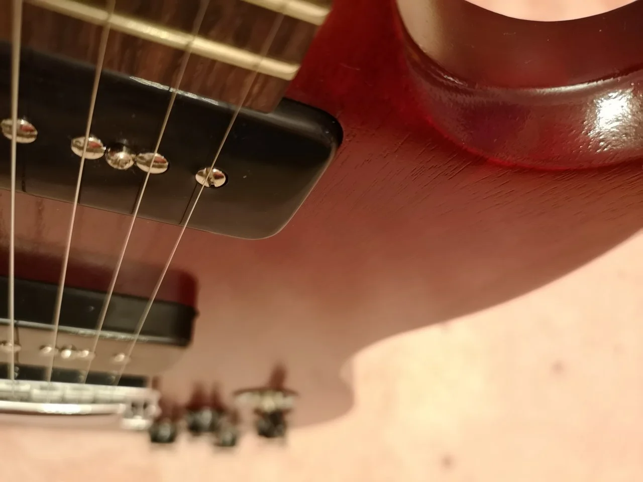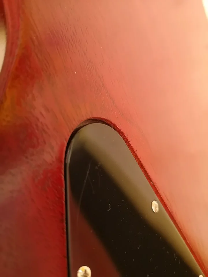 Zumindest bei diesem Exemplar passt alles, d.h. die 3 Teile vom Mahagonikorpus wurden gut zueinander passend ausgesucht (wegen der Lackierung kann man eh nur die Poren beurteilen, nicht die ursprüngliche Farbe, aber das zeigen die Pics gut), der Hals ist weder weich, noch sind die Bünde platt, im Gegenteil, sie waren positiv auffällig, weil sehr schön und genau abgerundet. Dass ich jetzt andere (dickere) einarbeiten lasse, ist meinem persönlichen Geschmack geschuldet.