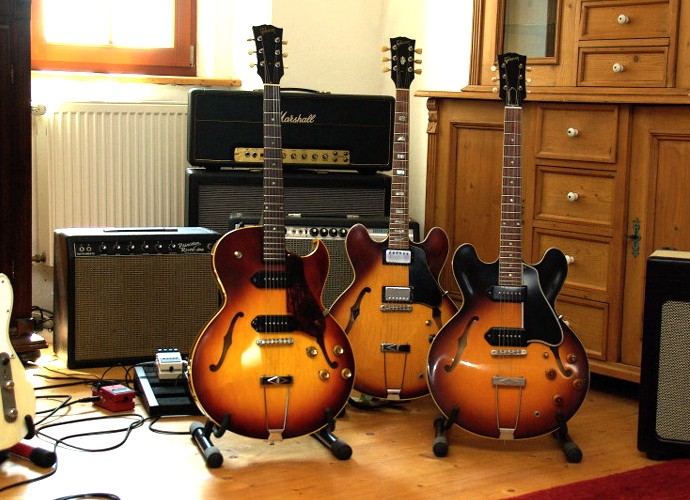 Die beiden P90 Hollows nehme ich vorzugsweise für angezerrte Bluessachen zur Hand. Die ES 335 ist Mädchen für alles.