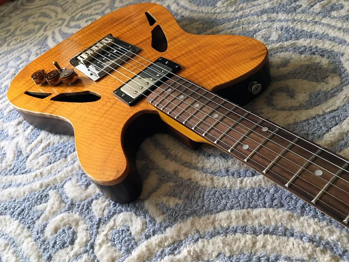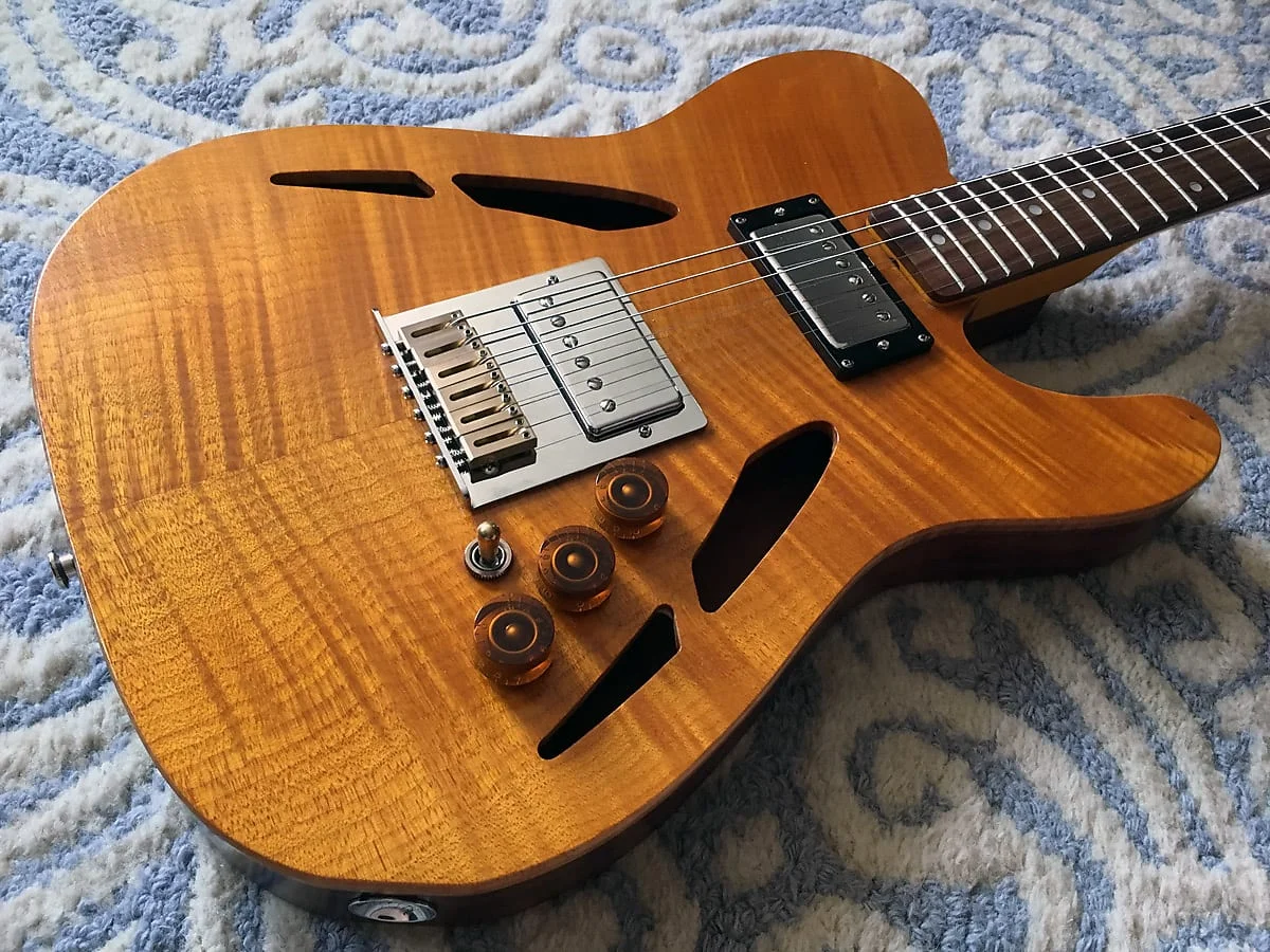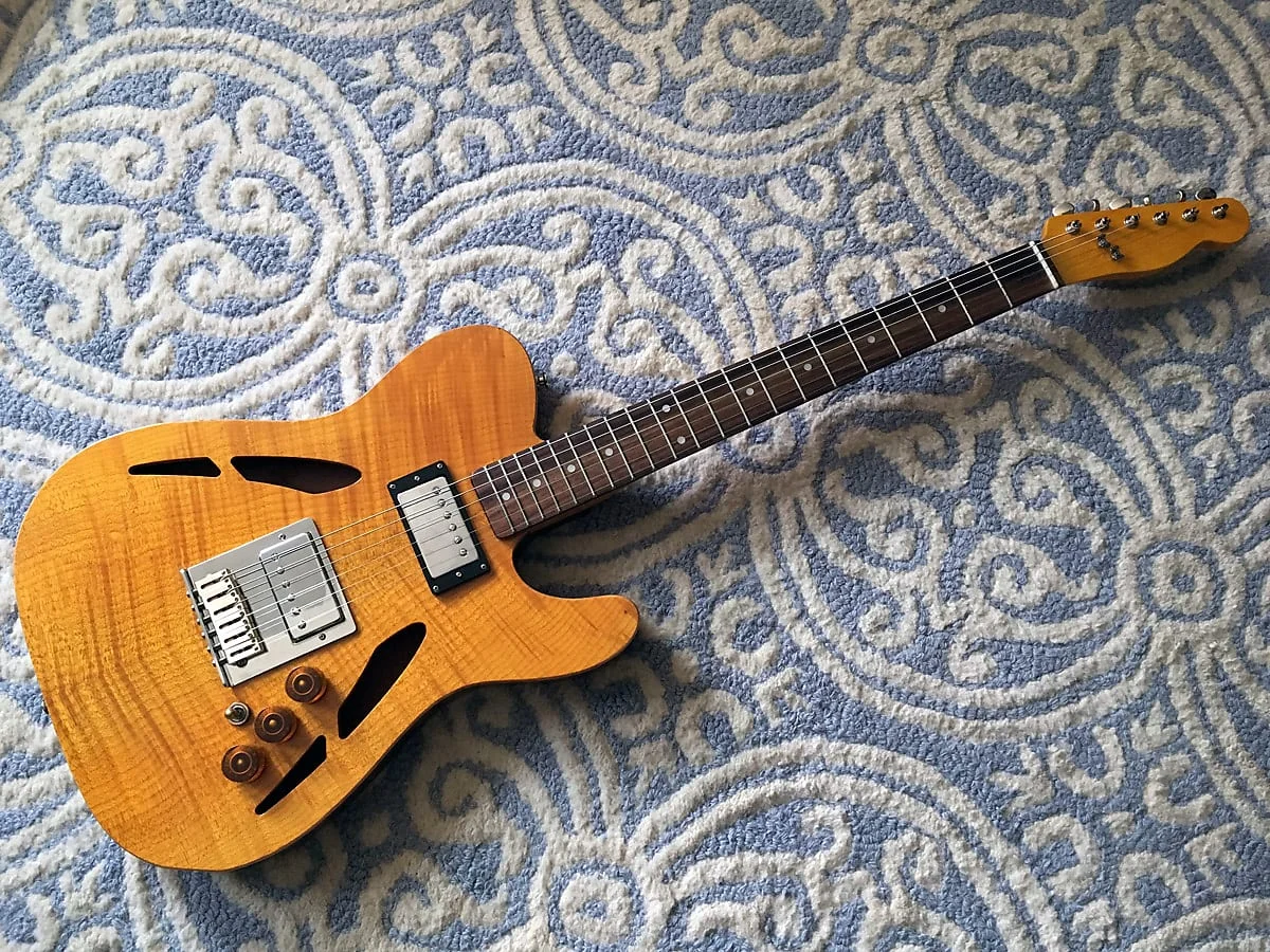Die Gitarre hat ein befreundeter Gitarrenbauer mal im Austausch fuer ein paar Pickups fuer mich gebaut. Etwas schwer fuer eine halb-akustische Telecaster, aber der Ton entschaedigt fuer einiges! Diese Gitarre hat VIP Pickups verbaut, die ich speziell auf sie abgestimmt und fuer sie gewickelt habe.