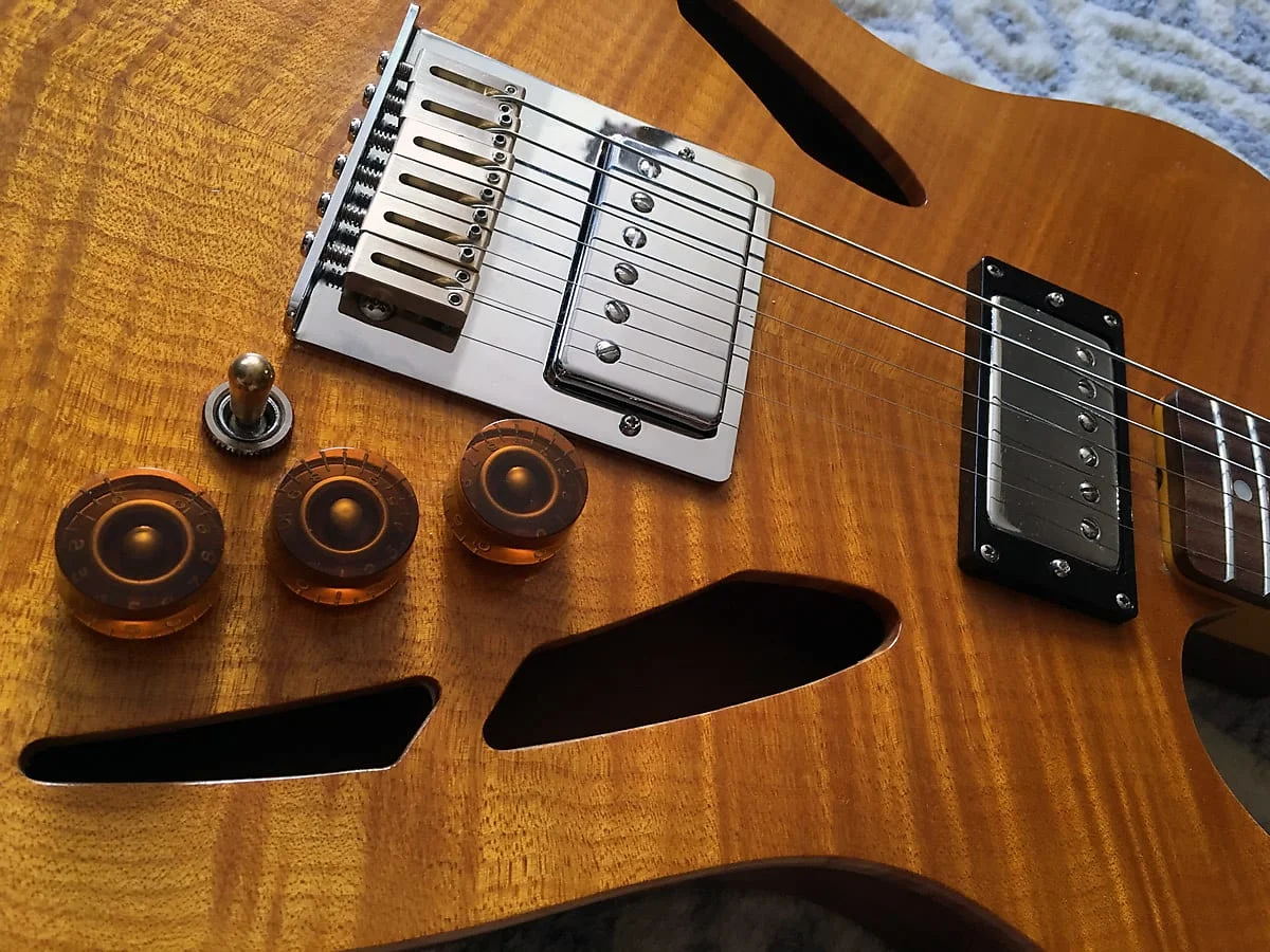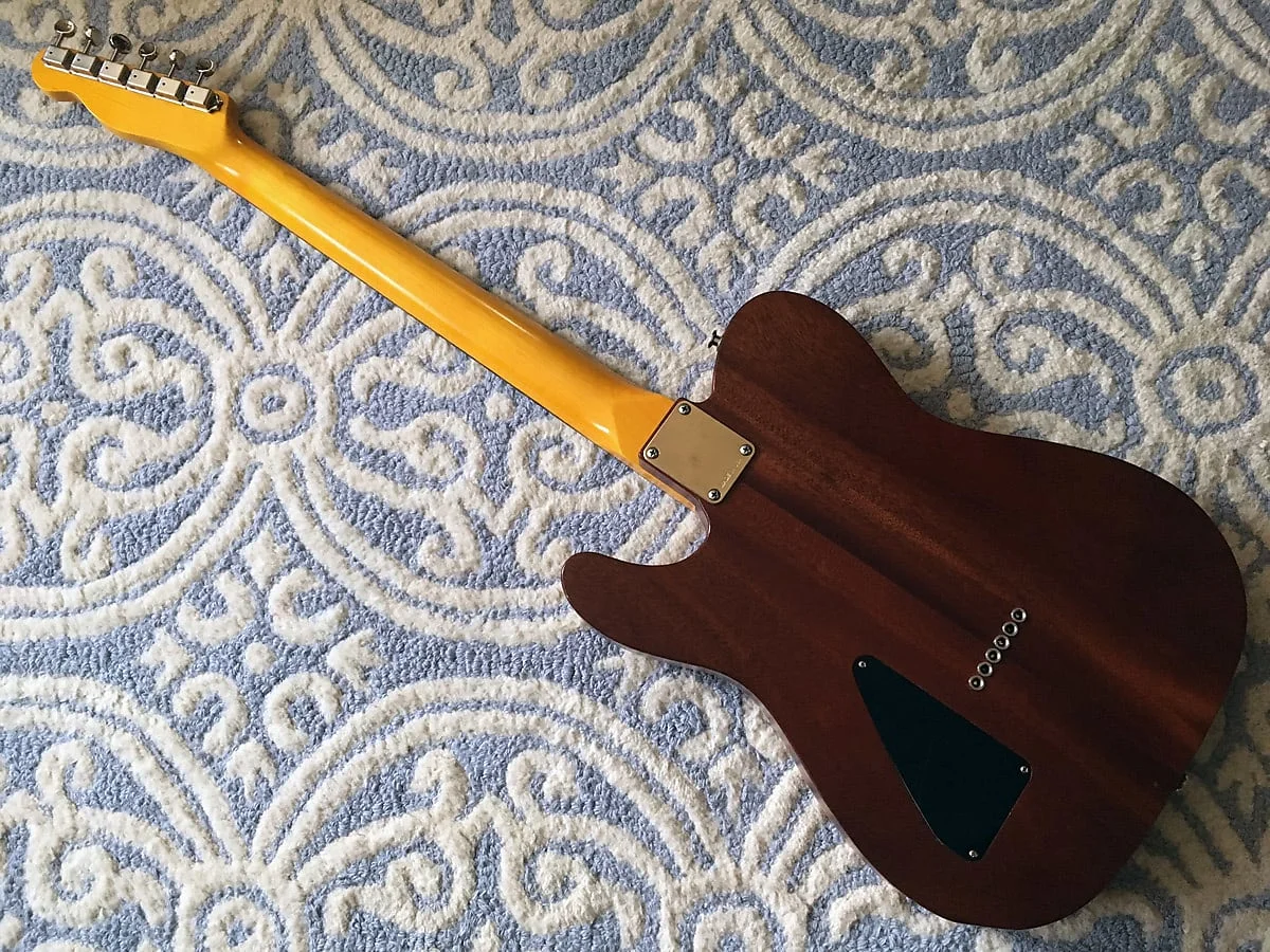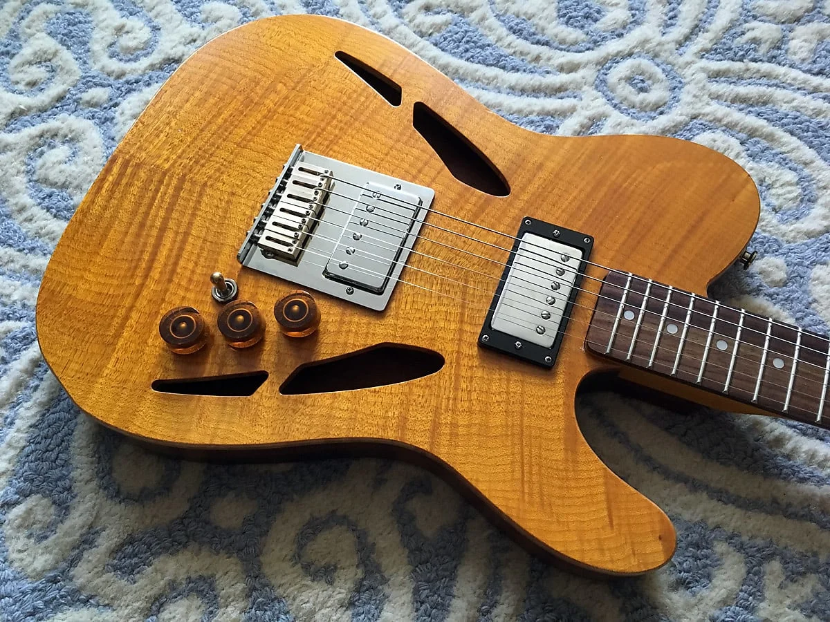 Die Gitarre hat ein befreundeter Gitarrenbauer mal im Austausch fuer ein paar Pickups fuer mich gebaut. Etwas schwer fuer eine halb-akustische Telecaster, aber der Ton entschaedigt fuer einiges! Diese Gitarre hat VIP Pickups verbaut, die ich speziell auf sie abgestimmt und fuer sie gewickelt habe.