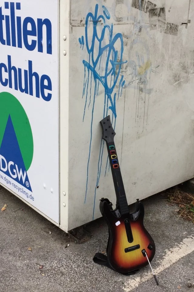 Fundstück heute morgen beim Altglas entsorgen .... ich habe sie dann doch stehen lassen, waren keine Saiten drauf