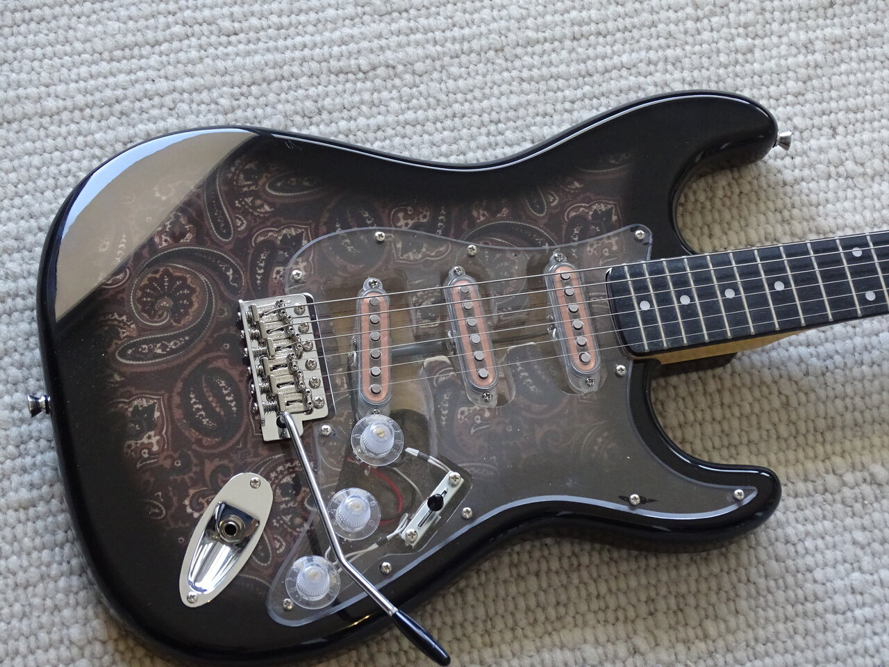 Eine Harley Benton ST-70 Deluxe Series in Black Paisley, umgebaut auf ein transparentes Pickguard mit handgewickelten Pickups und einer aufgeräumten Verschaltung.Anhang anzeigen 841380Anhang anzeigen 841381