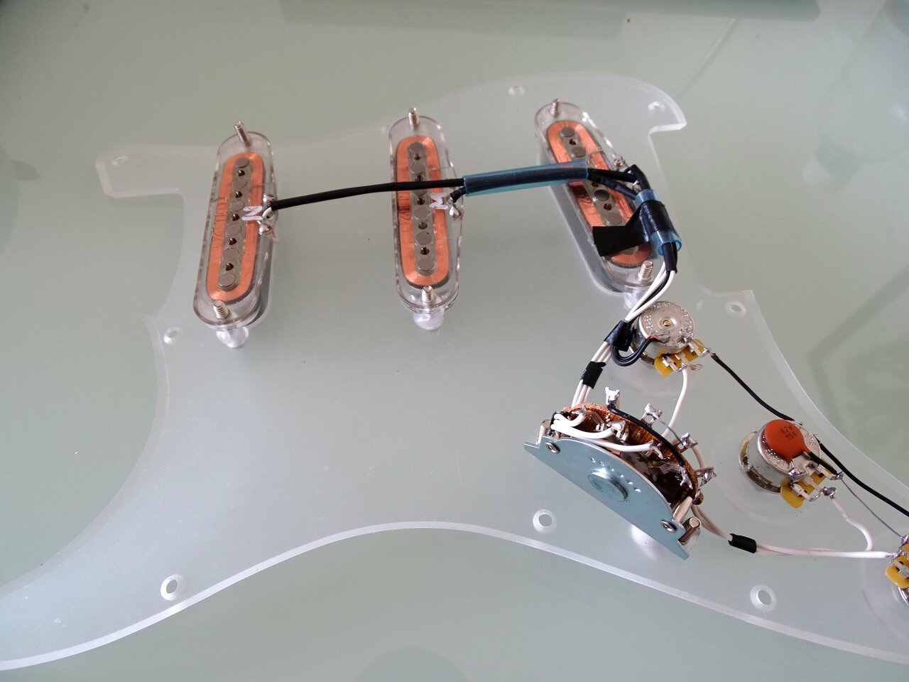 Das Pickguard, die durchsichtigen Spulen, Pickupkappen und Potiknöpfe sind von verschiedenen Internethändlern. Die Pickups sind handgewickelt. Beleuchtung mit LED folgt noch.Das ist mal ne coole Idee und auch schön ausgeführt. Alles selbst gemacht? Falls ja, hat man denn zumindest das Pickguard kaufen können, oder ist das auch selbst geschnitten?