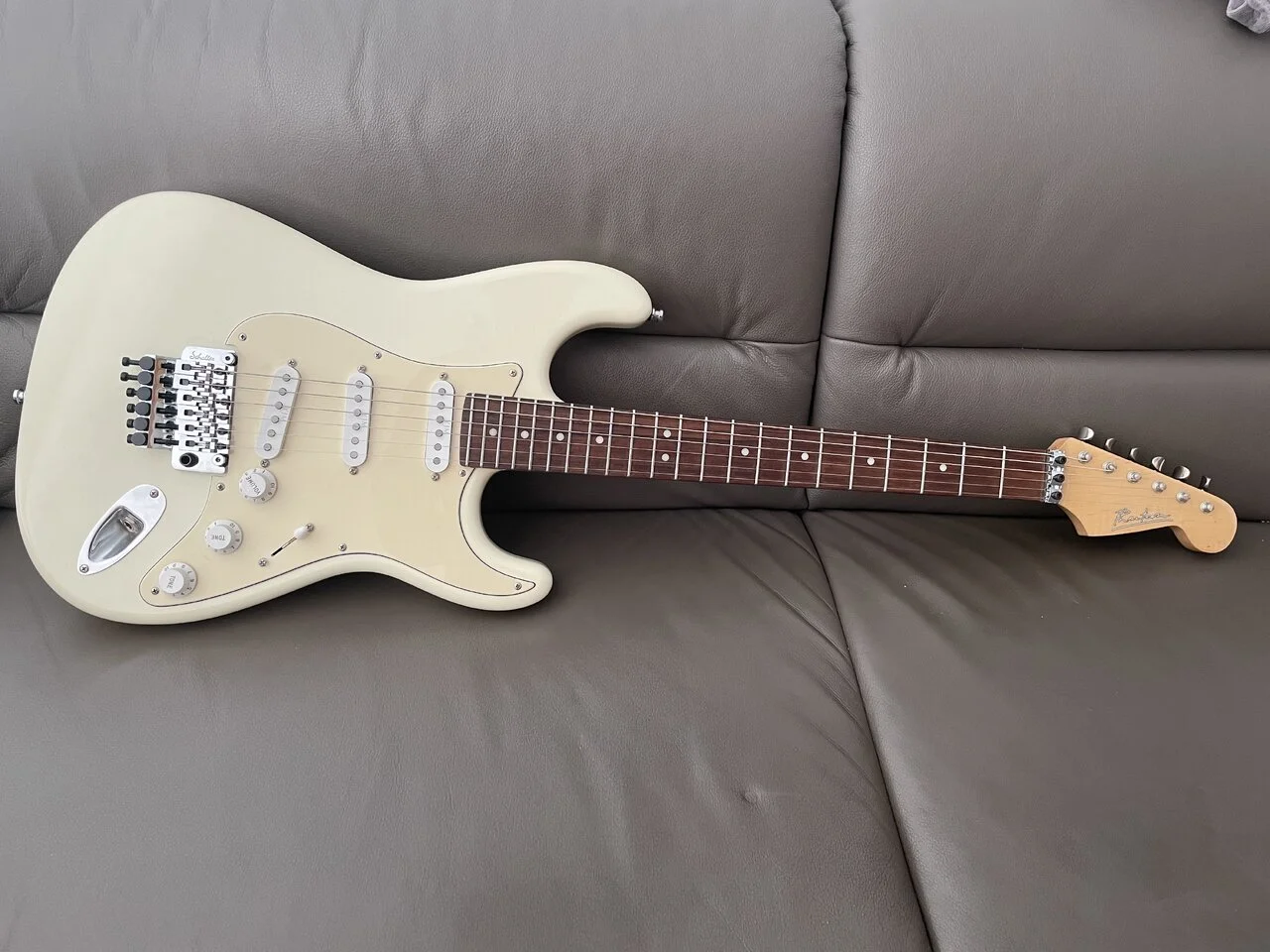 Klassische Stratocaster-Form mit "modernen Features", wie das Floyd Rose und den dazugehörigen Klemmsattel finde ich überragend hübsch (auch wenn ich absolut nicht mit Vibrato spielen kann). 👍 Womit ich allerdings gar nichts anfangen kann, ist die klassische Poti-Anordnung, da ich da immer am Volume-Poti hängen bleibe. 🙈😅
