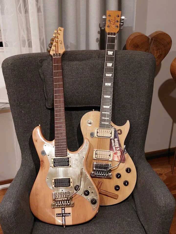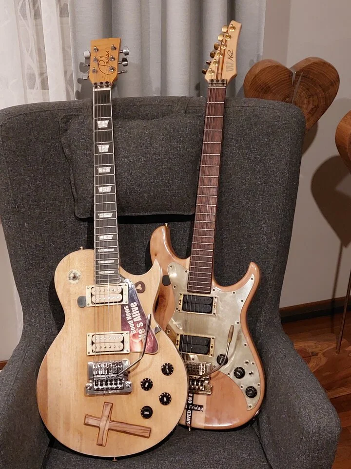 Das ist eine Hartung Junico. Ursprünglich mit Häussel P90 bestückt, vom Händler auf meinen Wunsch allerdings auf Lollar Goldfoil umgerüstet + mit Schaller Toplock Tunern ausgestattet. Klassisches No-Nonsense-Modell - 3 Grundsounds, kein Schnickschnack, angenehm leicht, super Haptik. Von der allgemeinen Verarbeitungsqualität praktisch die selbe Liga wie Nick Huber's Krautster, wenn ich sie mit irgendwas vergleichen müsste.Kannst du evtl. kurz was zur dritten von links sagen? Was für ein Modell ist das?