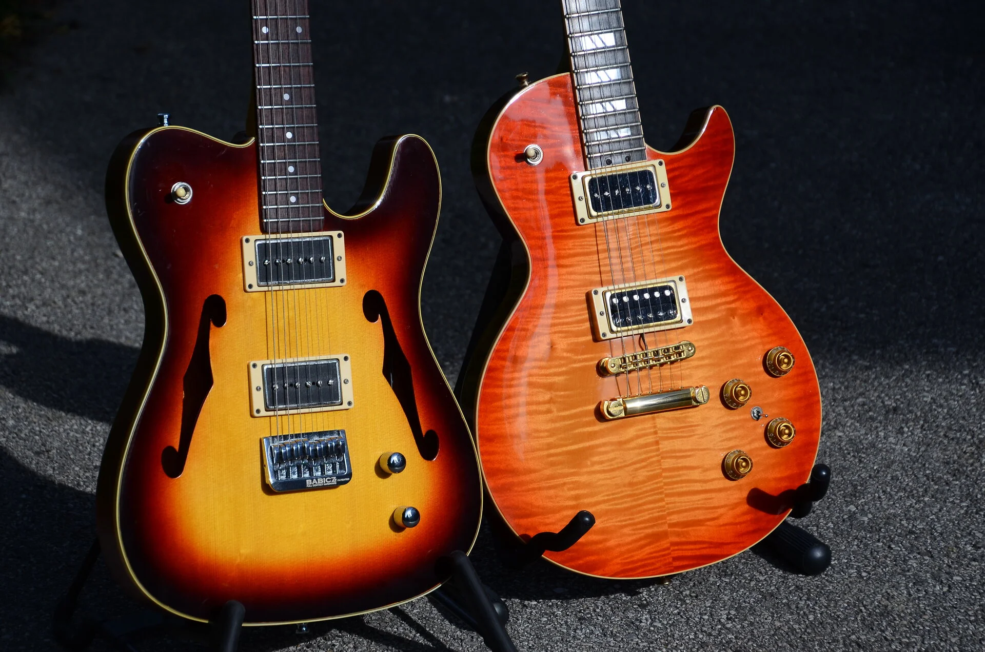 Trussrod Zugang unter dem 22ten Bund bei der LP? Nice!Mal eine andere Tele, handmade in Austria by Andreas Neubauer, angenehme 2650g leicht, aufgerĂŒstet mit HĂ€ussel P90s und Babicz bridge (hier neben einer Neubauer Les Paul).