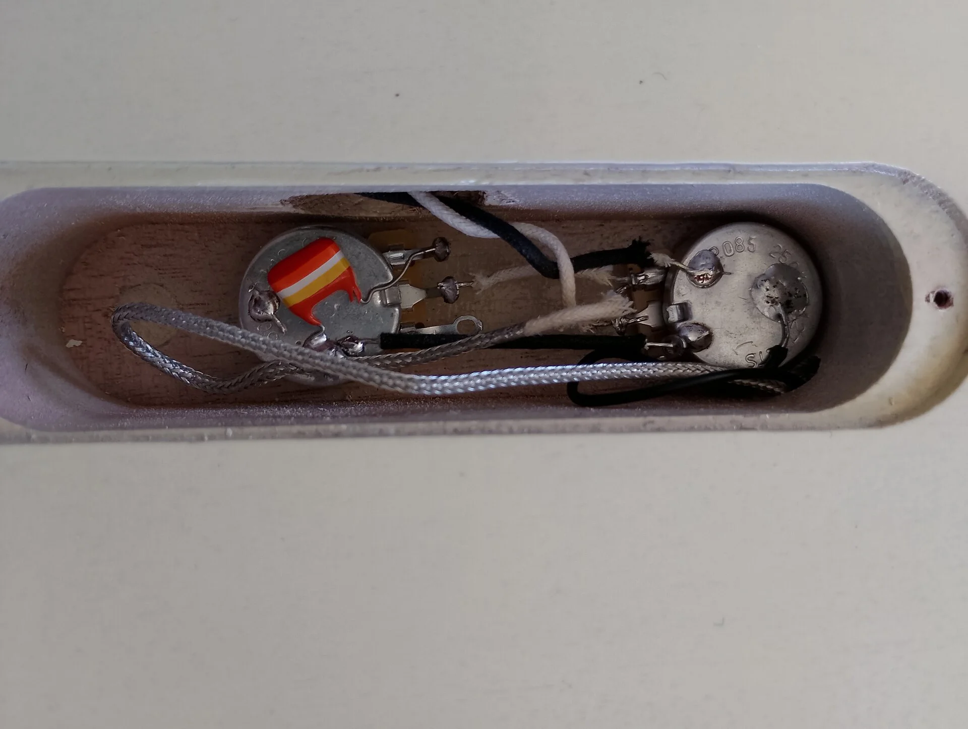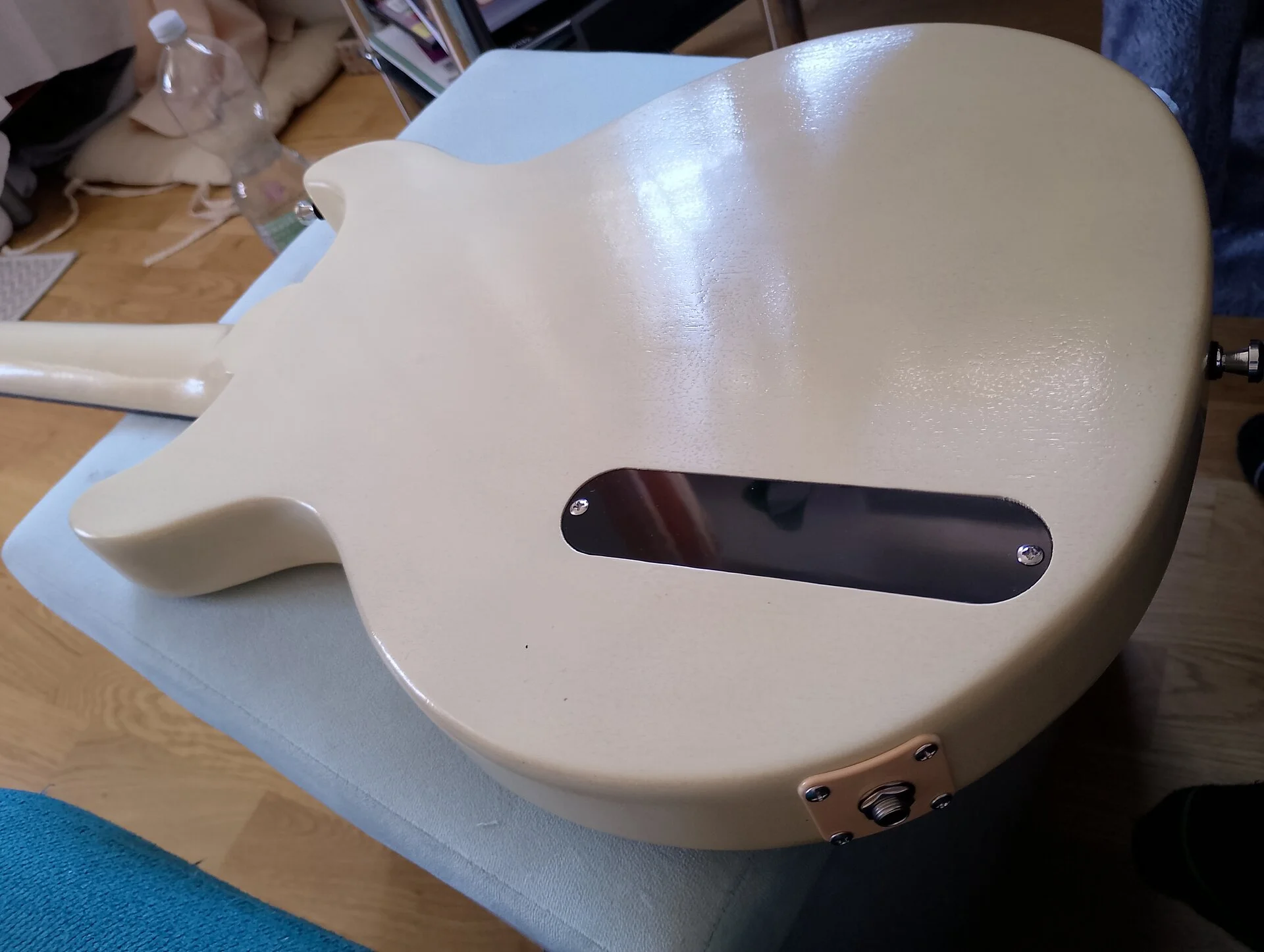 Der Body und Hals sind komplett weiss gebeizt, darüber Vintage 50s butterscotch Transparent. Wirkt eher wie dreckiges Vintage White aber für mich mehr buttrig und genau mein Geschmack 😃