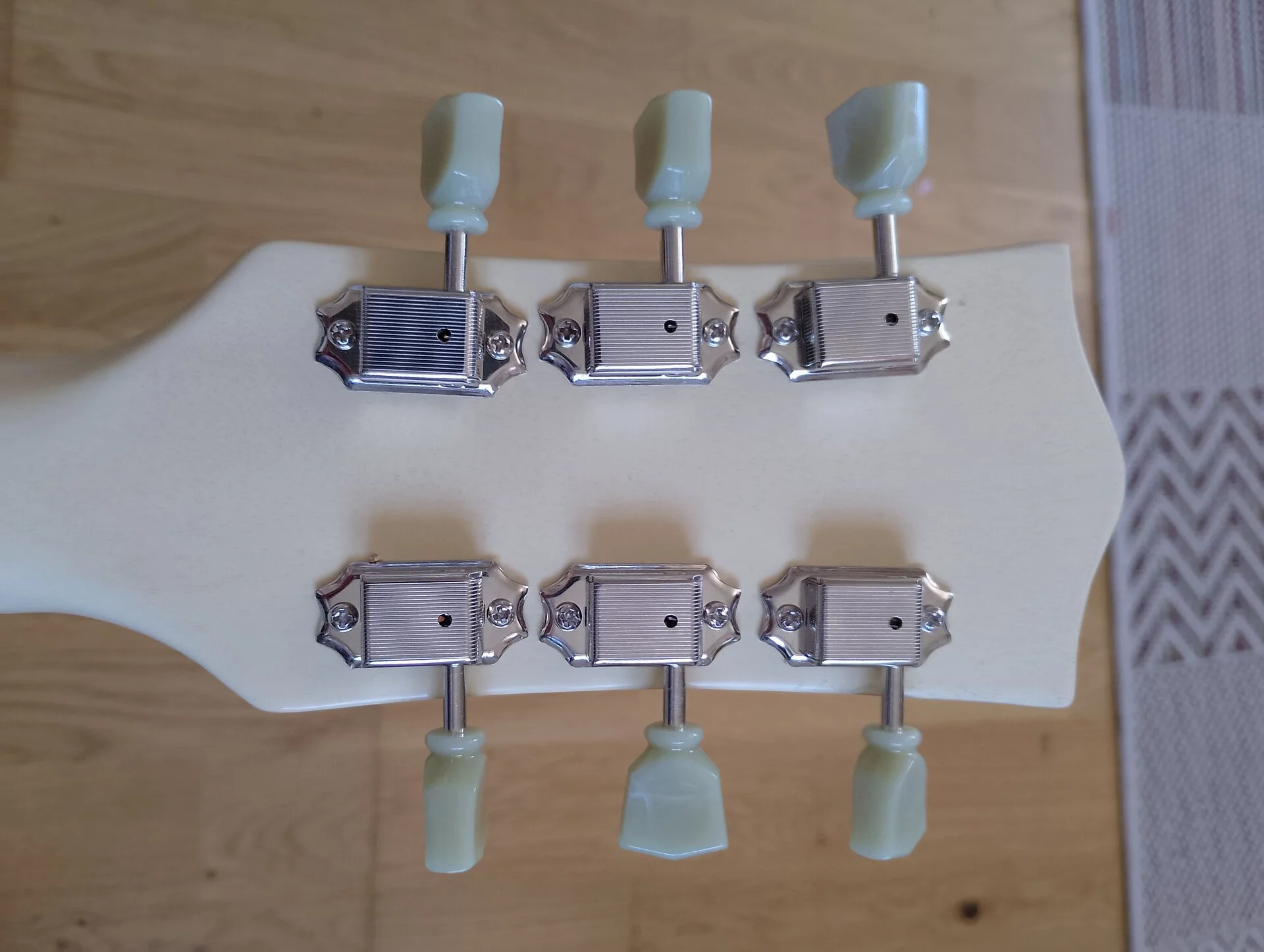 Moin. Im Prinzip ganz einfach. Anstatt der Drehplatte hinten ist der Lockmechanismus die Öse wo man die Saite durchzieht. Dieses sitzt auf dem Lockinstift und lasse sich drehen, allerdings ist das Gewinde verkehrt herum.
