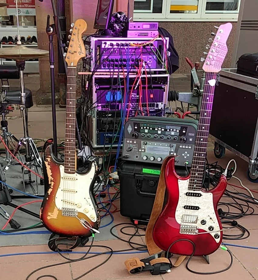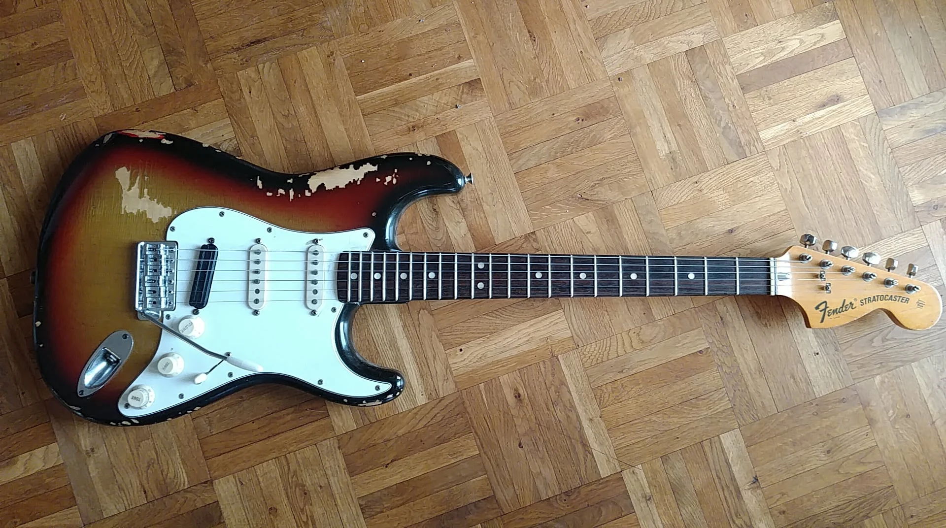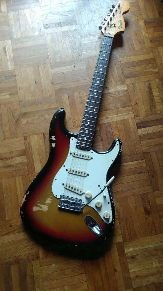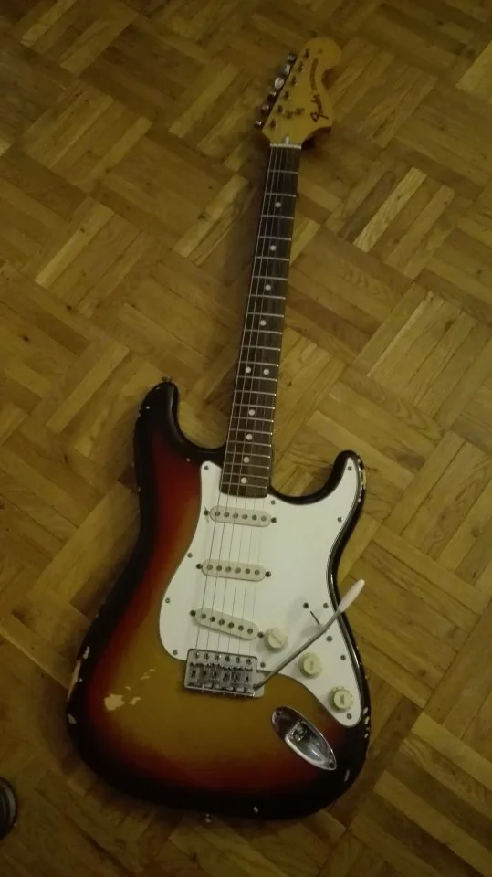 )Die Jagmaster habe ich mehrfach modifiziert und Original war ein Strat Tremolo-System verbaut, das mir nicht gefallen hat. Die Öffnungen vorne und hinten habe ich mit Holz verschlossen. Daher auch die Federfachabdeckung. Hier sieht man wie es unter dem Pickguard aussieht.Was hat es mit der Federfachabdeckung auf der Rückseite auf sich? Federn sollten an dieser stelle ja keine sein...