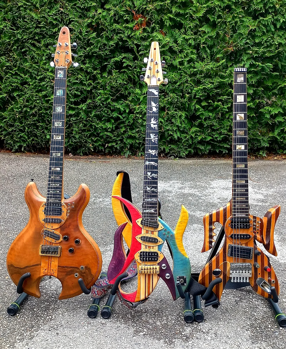 Hier ist gerade die Sonne draußen und da habe ich mal zwei farbenfrohe Gitarren nach draußen geschleppt: