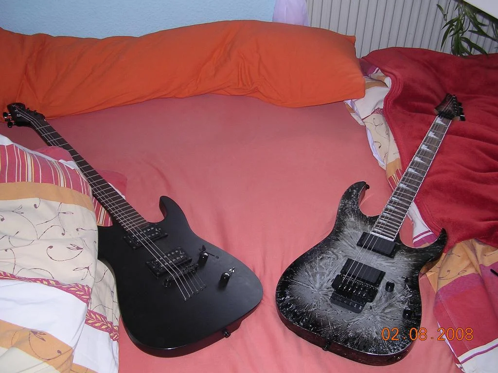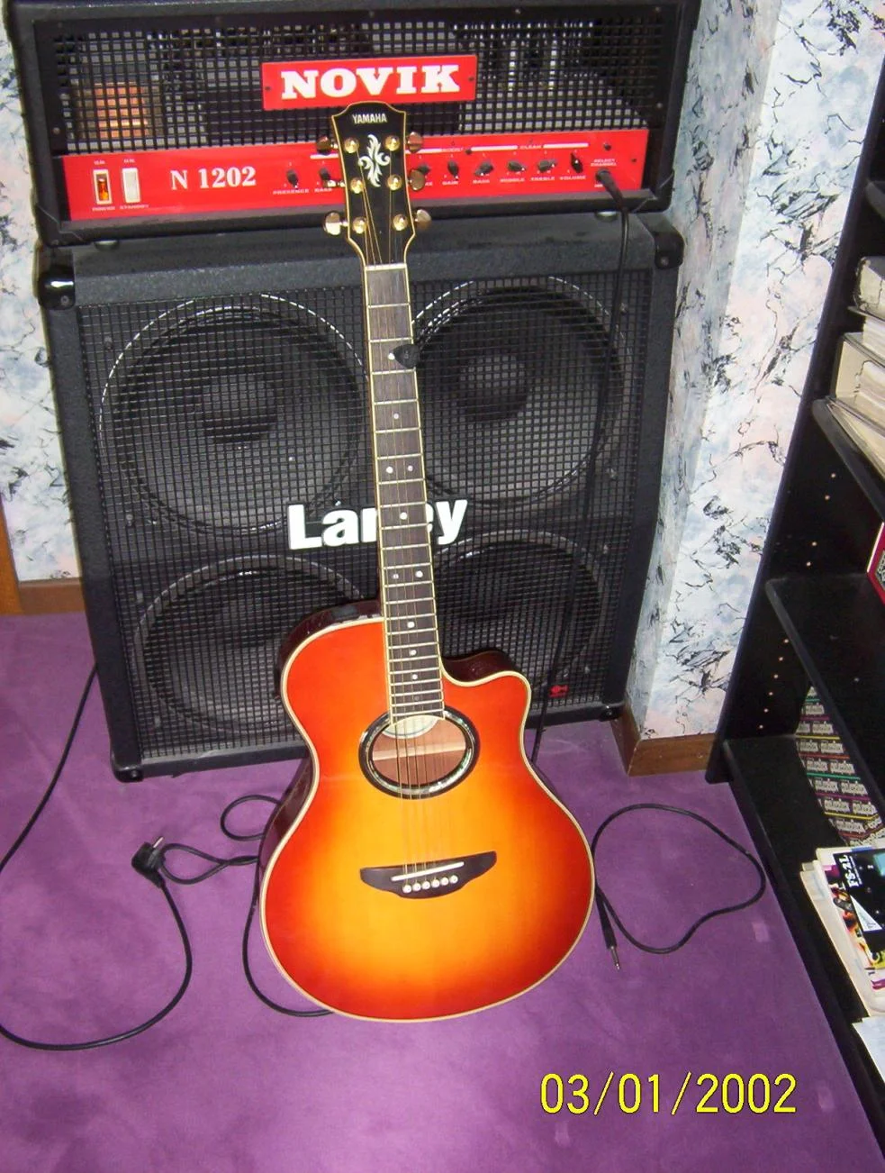 Auf dem ersten Bild, meine Hauptgitarre, eine Epiphone LP aus Anfang der 90er Jahre, das zweite Bild zeigt meine Yamaha Semi-Akustik vor meinem Novik/Laney-Halfstack. 🙂