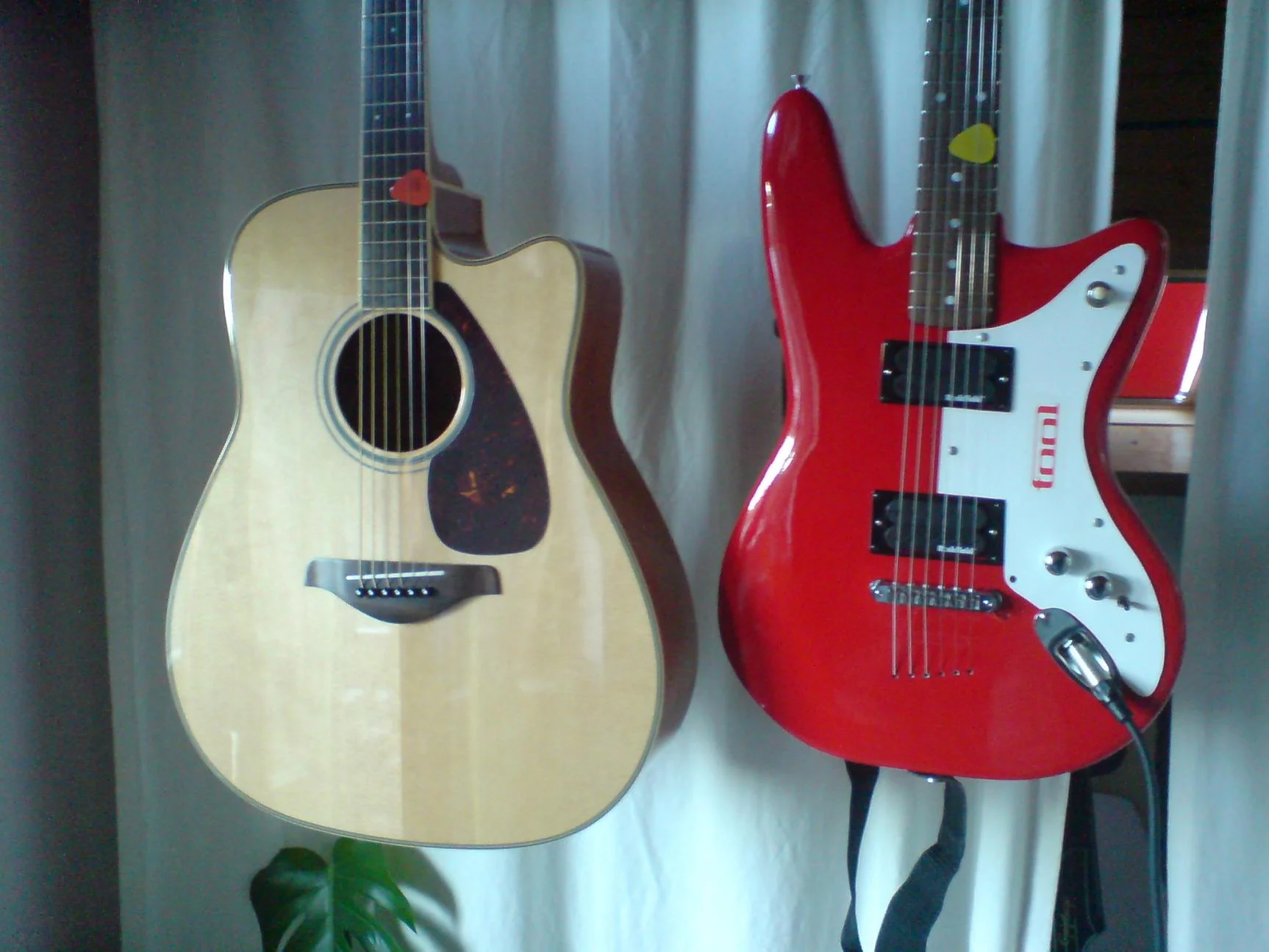 Hier mal meine neue Lag Imperator, Yamaha-Akustik- und meine zweite (wieder umgebaute und mit Rockinger-Pickups bestückte) Selbstbau-E-Gitarre.