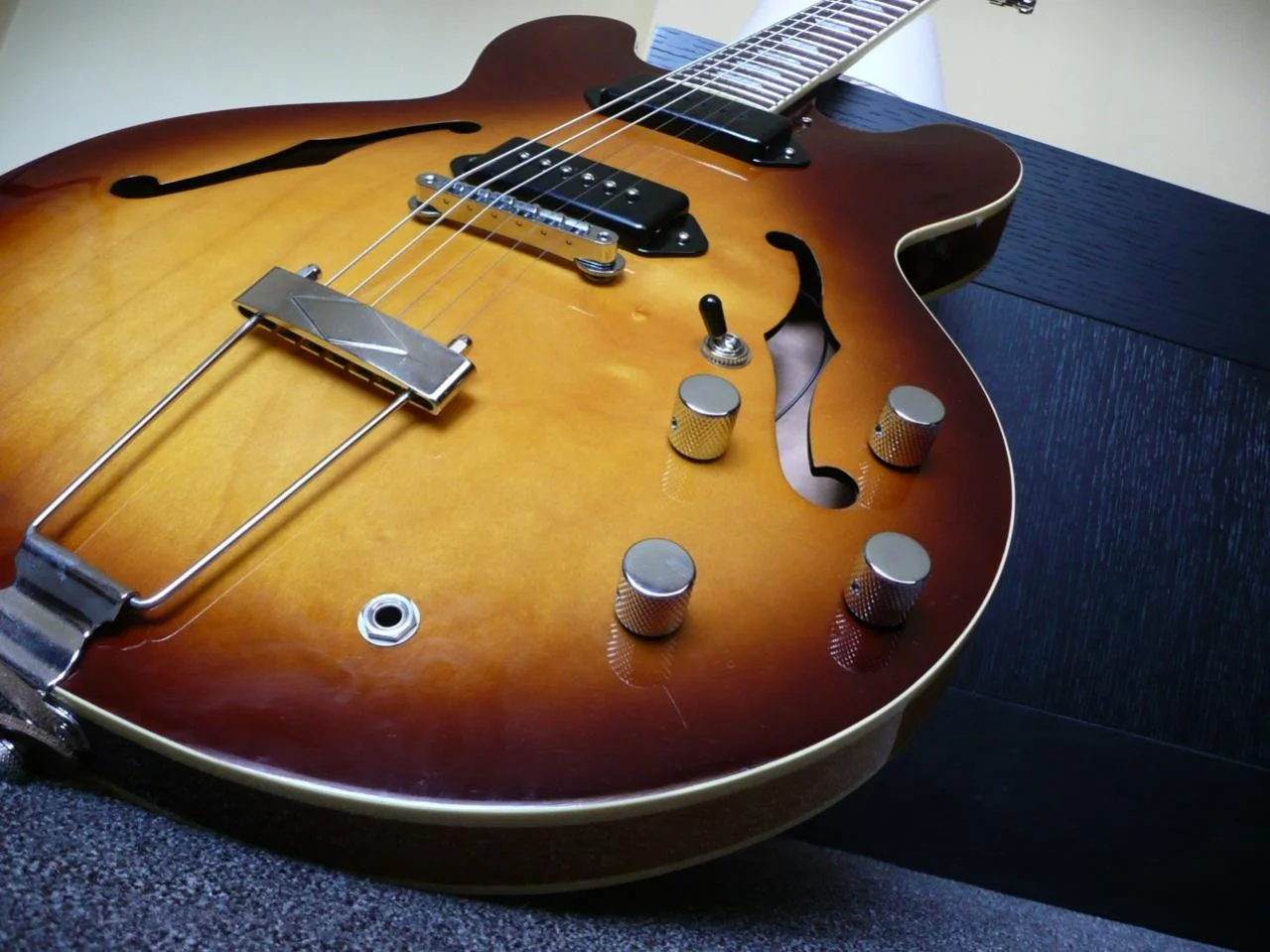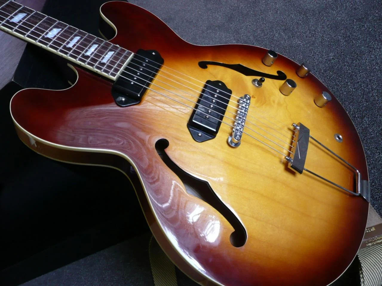 damit es nicht vollkommen offtopic wird, hier noch ein bild von einer yamaha jazzgitarre, die leider leider nicht mehr in meinem besitz ist, aber mir ne schöne zeit gegeben hat. war leider nicht 100% mein gewünschter sound, deswegen der verkauf. ich wollte mehr einen jim hall mäßigen muffsound, und die yamaha klang viel zu brilliant und westerngitarrig...