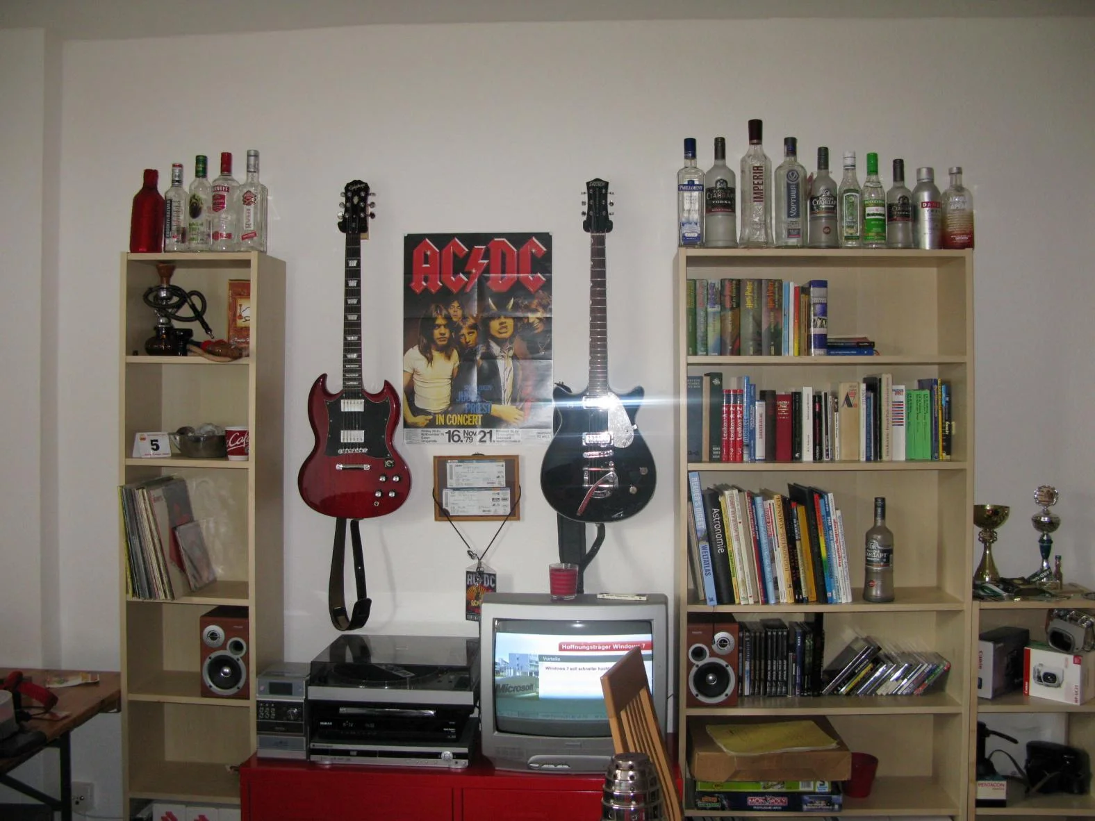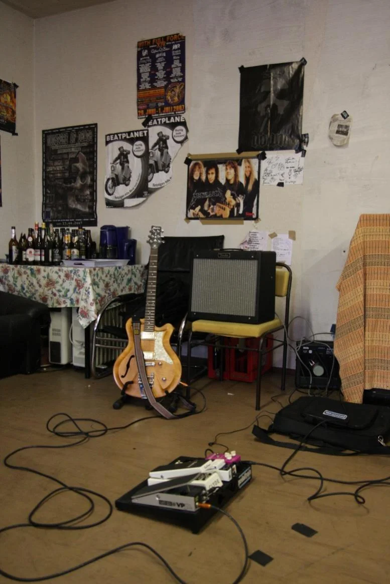 E: Hier mal noch n Bild von Lucy und Gretchen. Ivan der Amp steht gegenüber, Horst der Bass ist rechts leider nich mehr im Bild und für Emma die DDR-Klampfe brauch ich noch n Wandhalter... ich muss wohl maln Panorama machen