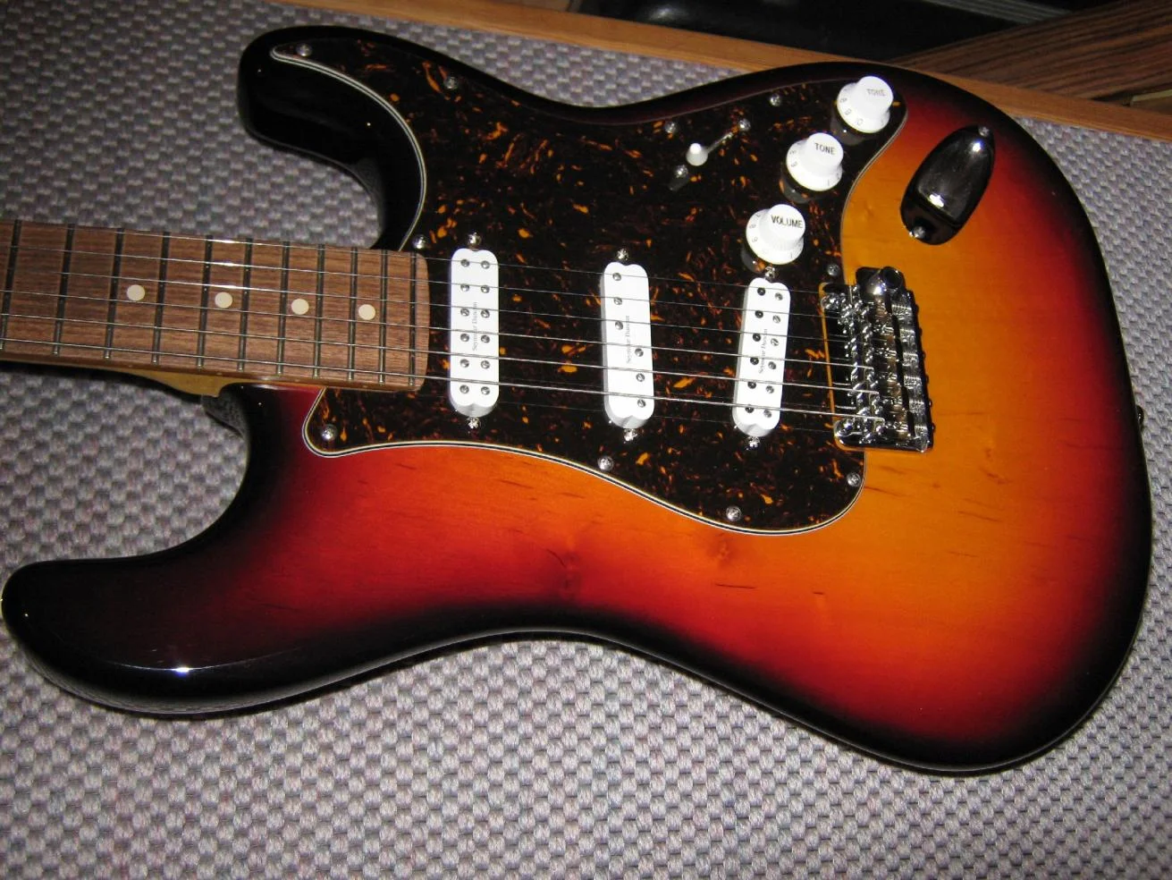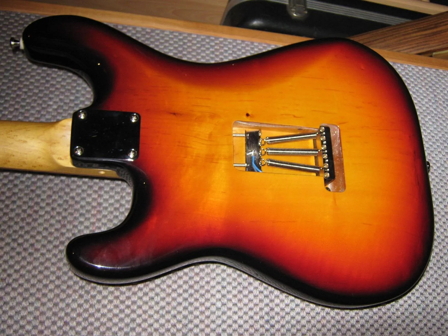 nun Taten - sprich Bilder: Powerstrat mit Esche Korpus, Ahornhals, Palisander (Indisch) Griffbrett. PU's: Custom 59er splittbar. ABM Tremolo 5200 Knife Edge. Lackierung Grün Burst auf Schwarz. Freitag fertig, schon auf großer Reise. Grün ist nicht so meine Farbe, aber dieses passt schon zur goldenen Hardware, oder? murle1