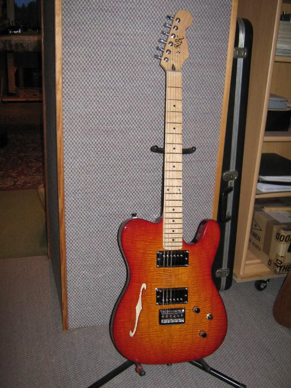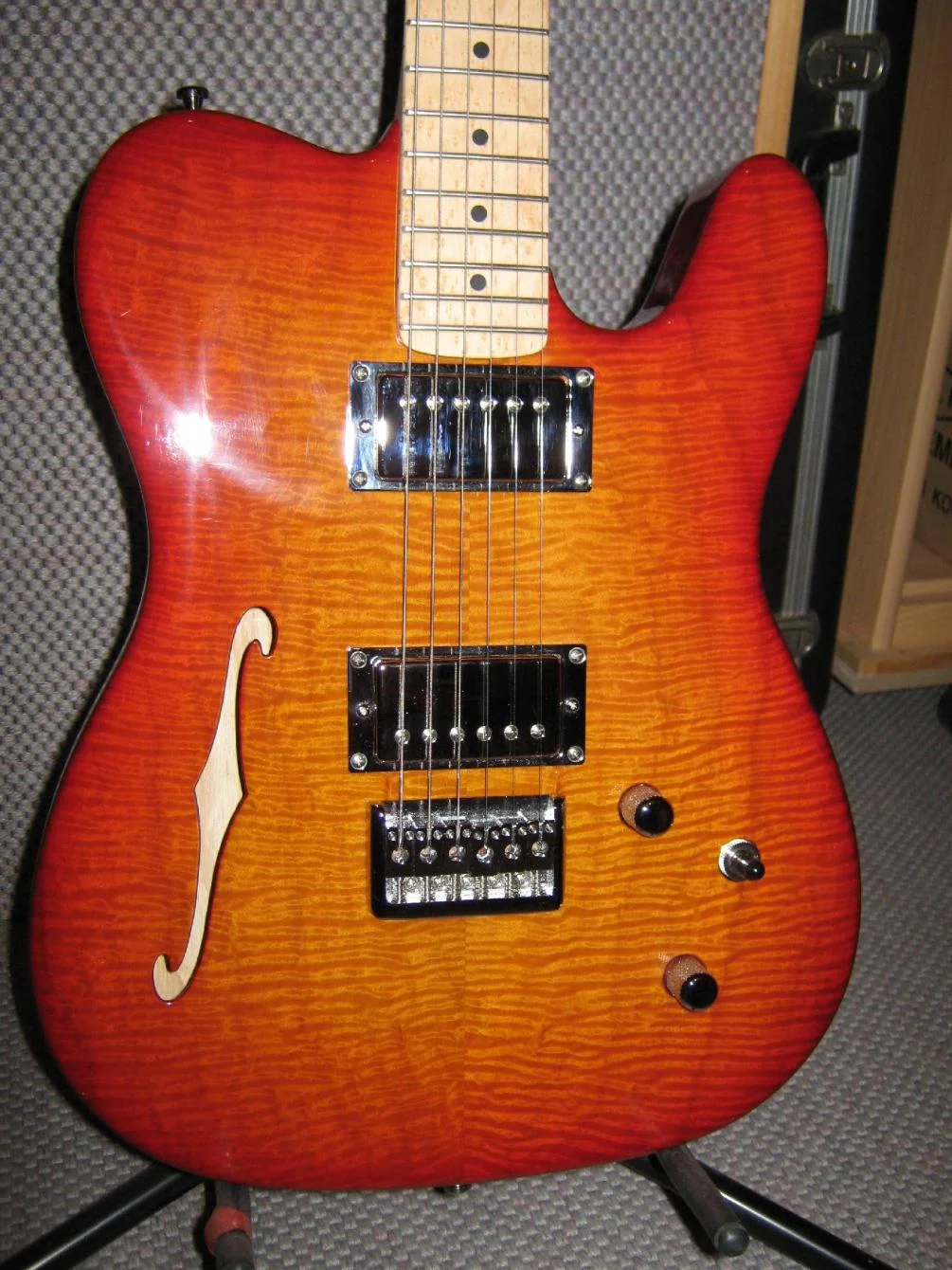 Tele Form, mittlere Esche, Hohlkammern, Quilted Ahorndecke mit F-Loch. Asymetrische 6fach Verschraubung, Vogelaugenahornhals und Gotoh Lockingmechaniken, Häussel Humbucker mit Splitmodus.