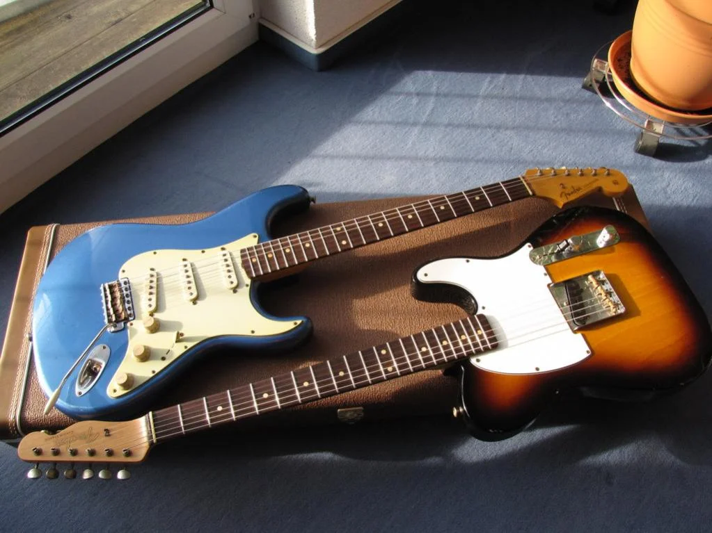 Hier mal 2 Bilder meines letzten Weihnachtsgeschenks an mich selber (die 60er Relic Strat) und auf einem ist noch die Esquire mit drauf. Bei Gelegenheit werd ich irgendwann noch bessere Bilder machen, das Sunburst der Esquire kommt hier nämlich auch rötlicher rüber, als es eigentlich ist.