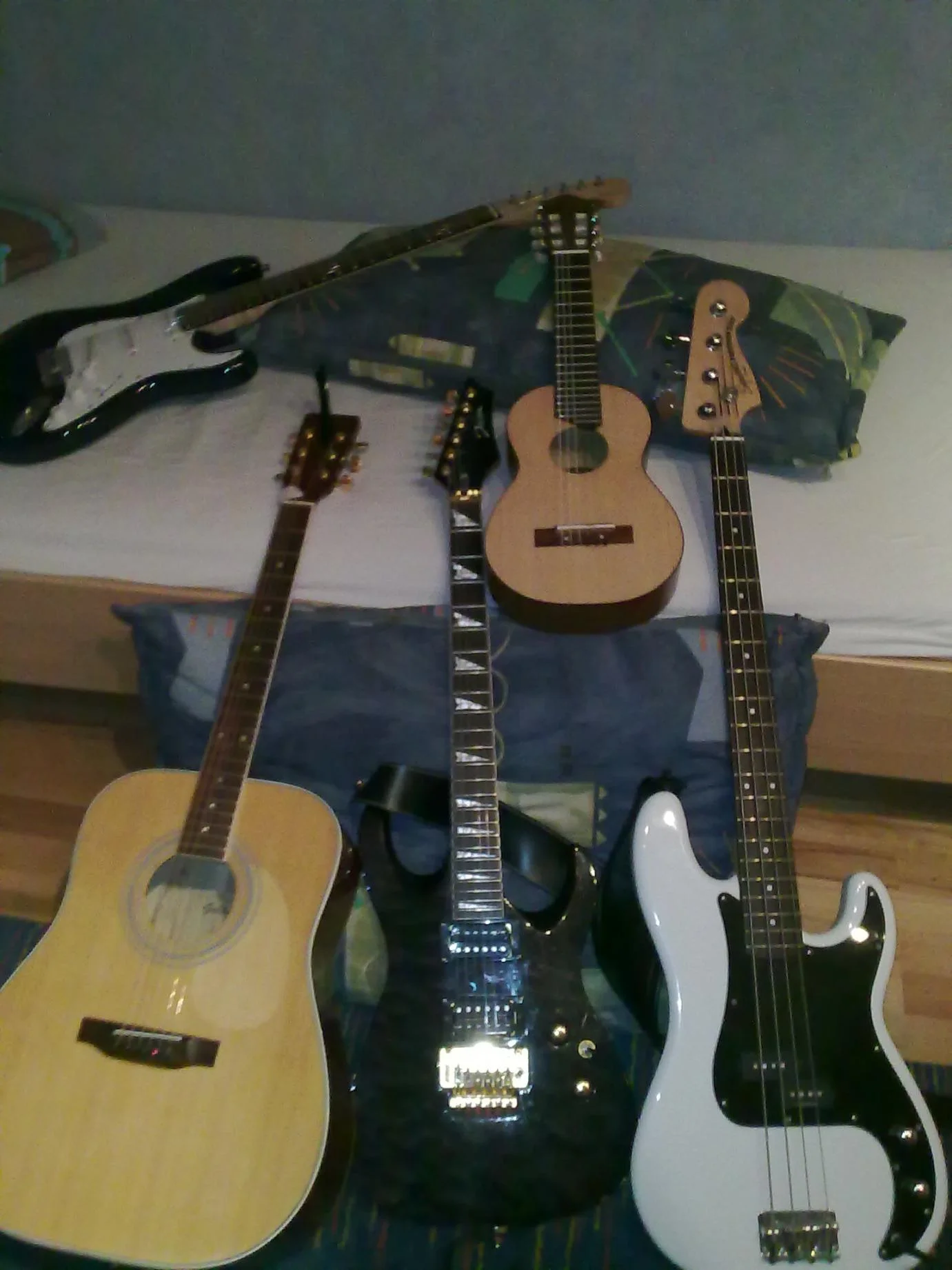 Noch ein lackierter Hals und ein schönes Ebenholzgriffbrett, und die Gitarre wäre ja sowas von hot. (ist sie auch so schon😉😛)von links nach rechts: