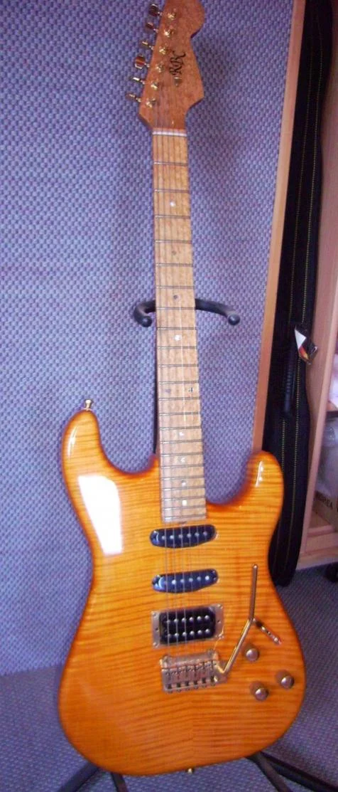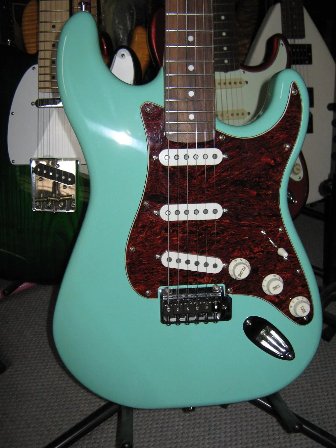 Wie die gitarre klingt, werd ich dann ja sehen 😛Moin, mal ne Strat von mir. Korpus Erle, Hals Ahorn/ Palisander, Mechaniken Kluson Backlocks, Häussel PU's, ABM Tremolo. Surf Green. murle1