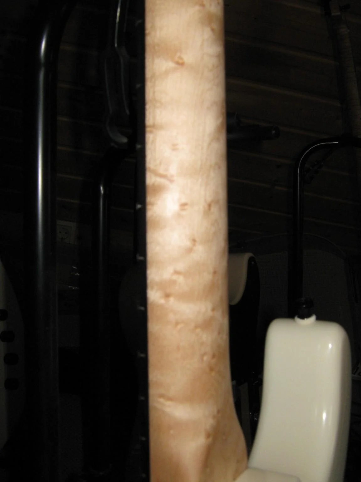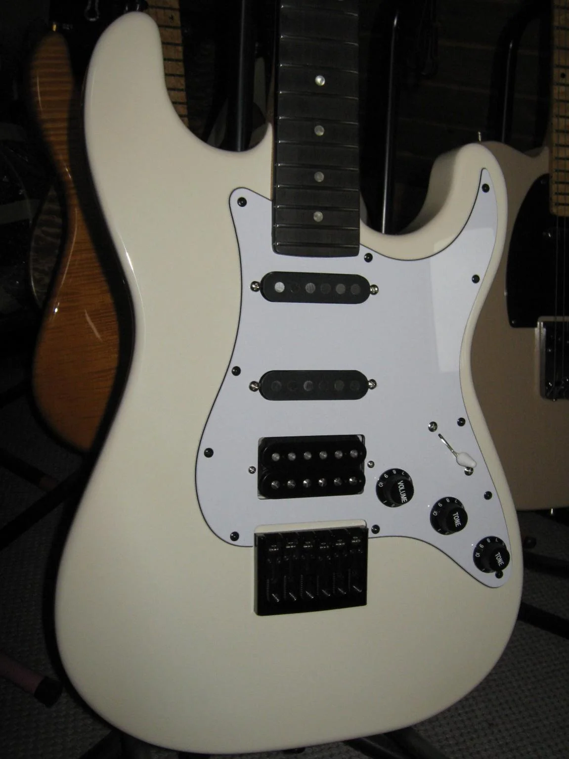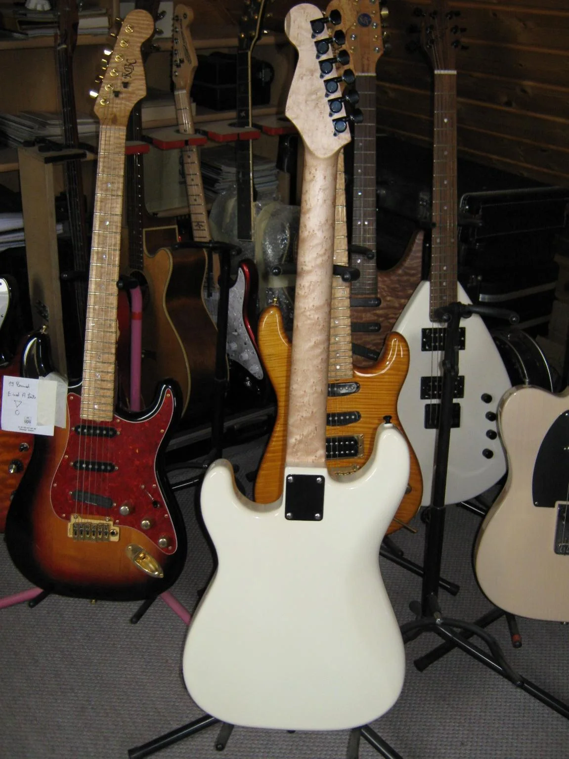 Das tropfenförmige Ding ist ein leicht veränderter Nachbau einer VOX Gitarre aus den 60ern. So eine, wie ich sie selbst gesehen habe in einem kleinen TV Studio an dem verstorbenen Stones Gitaristen Brian Jones. Entstanden ist sie nach dem Betrachten eines alten VOX Katalogs, nach dem meine Kumpels einige unschöne Dinge über die Form sagten. Danach bin ich in die Werkstatt und hatte nach 18 Stunden das Teil spielfertig, aber noch roh und ungeschliffen. Durch die große Masse an Ahornholz (Korpus) und dem harten Padoukhals hat das Teil Sustain bis zum Abwinken, mit SH1 und SH4 und fester Brücke, die gleiche wie auf der neuen Strat. Das ich bei Baubeginn ganz nüchtern war?? Glaube nicht! murle1Was ist denn das tropfenförmige Ding dahinter?