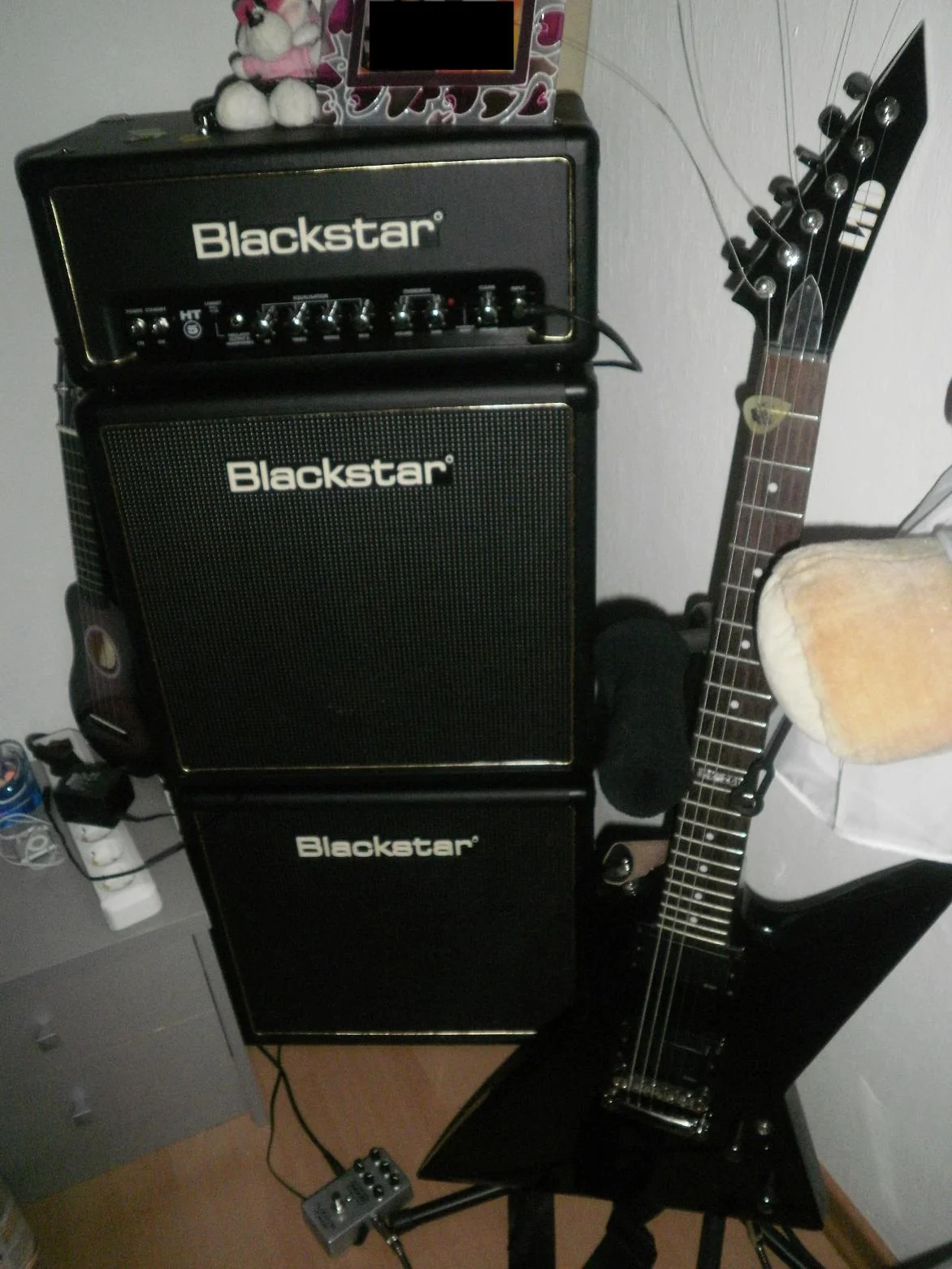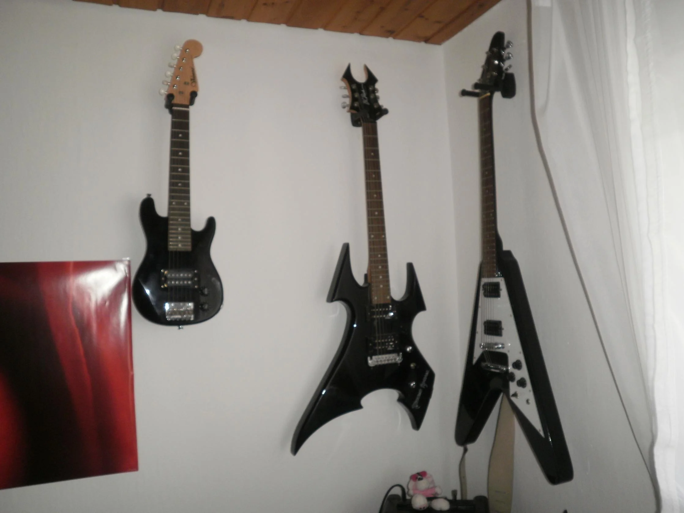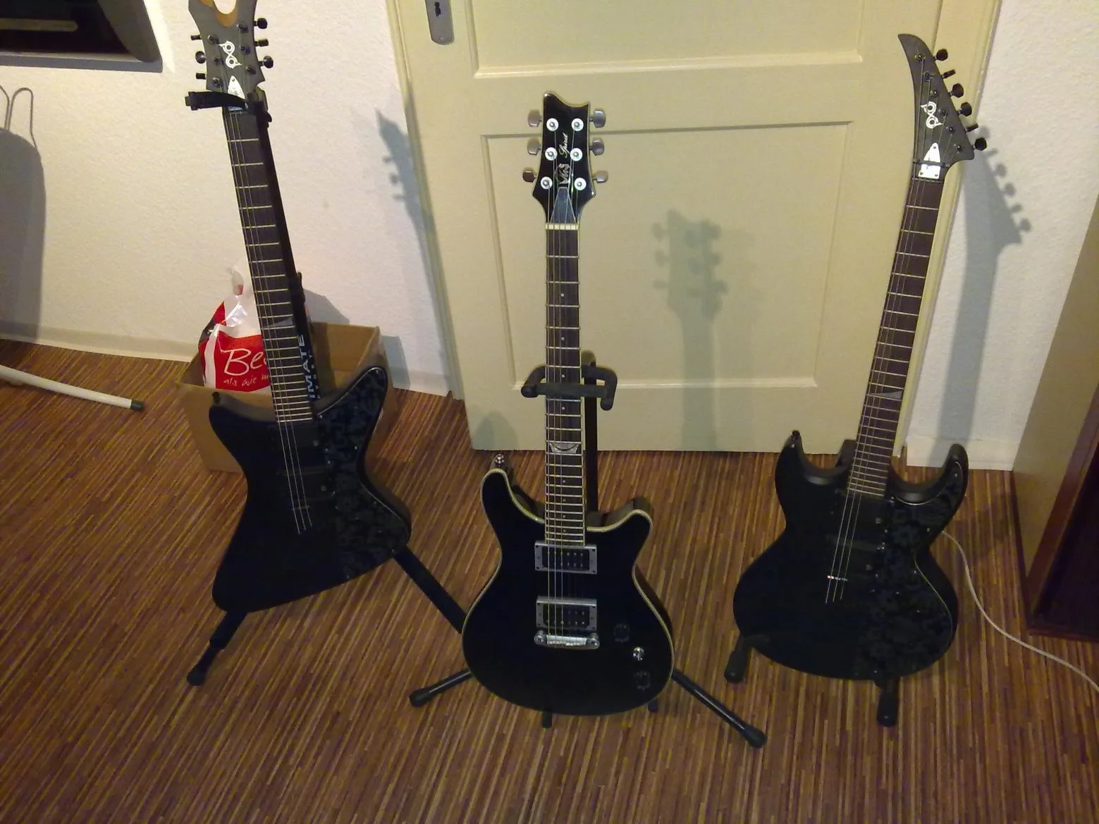 (der aber ein rot gemustertes Schlagbrett hat) nicht mitzählt, meine einzige schwarze Gitarre sein. Meine Traumgitarre wäre nebenbei sowieso eine schöne Telecaster... *träum* 😎
