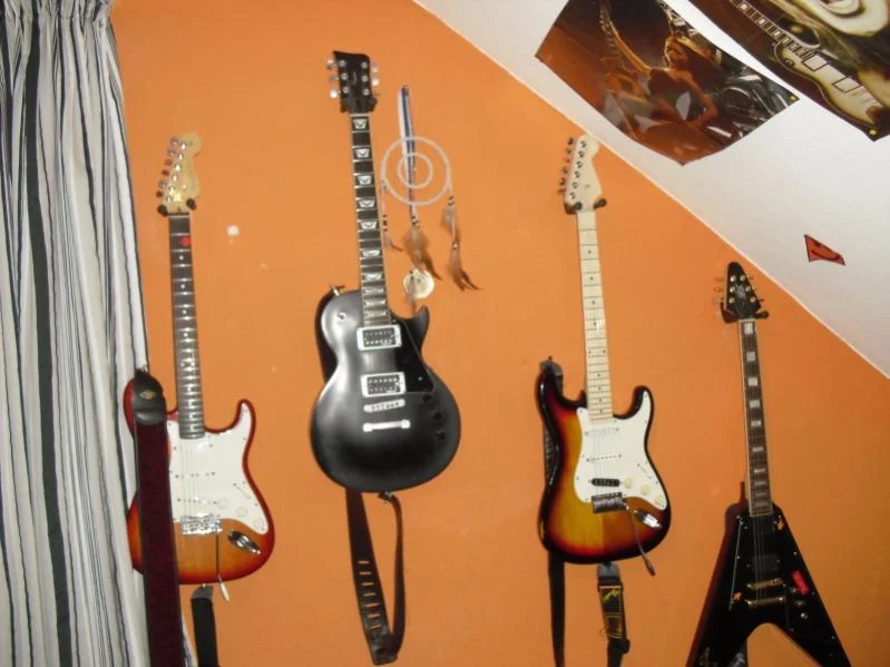 Das war meine erste. Billig-Strat-Kopie von einer Firma namens "Chester." Spielt sich schlecht, klingt schlecht. Aber ca. 5 Jahre lang hatte ich keine andere.