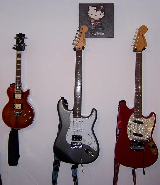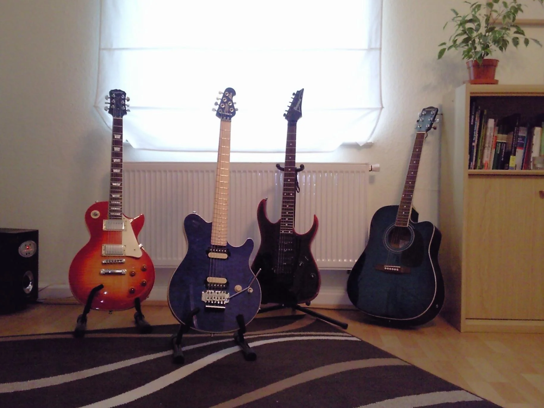 Hi!!! Hier mal meine Schätze....(Amp und Board kommt später mal) von links nach rechts Epiphone Les Paul Cherry Sunburst, Sterling by MusicMan AX-40, Ibanez RG (Japan).