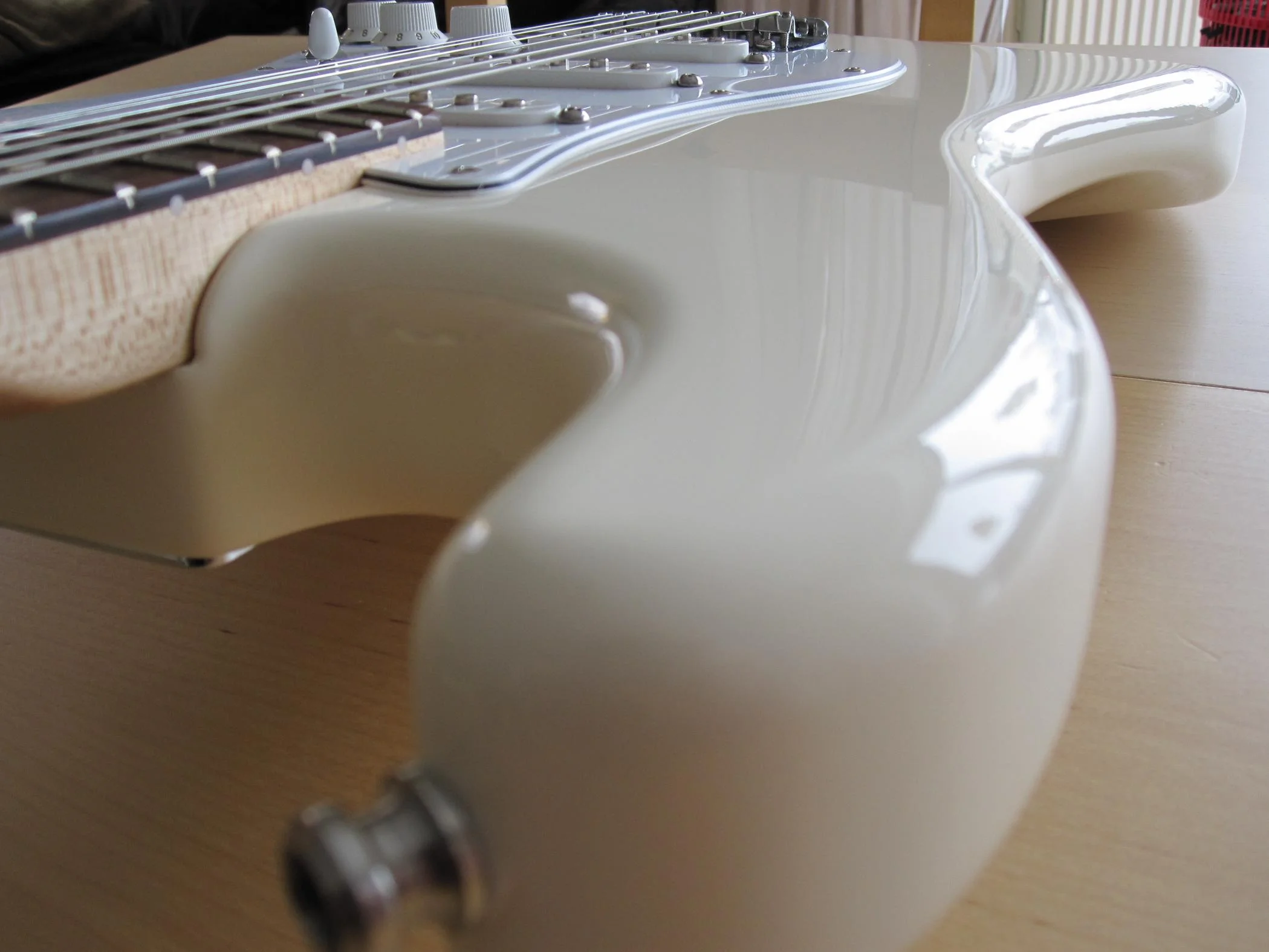 Zeitspanne so ca. 3 Monate, reine Arbeistzeit an der Gitarre würde ich schätzen vielleicht 2 Tage, man muss sich ja auch erstmal alle mechaniken, die dots, die Kabel die Knöpfe ect. ect .ect. zusammensuchen und dann warten bis es ankommt.