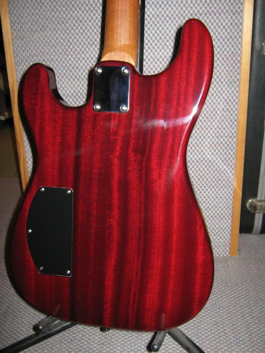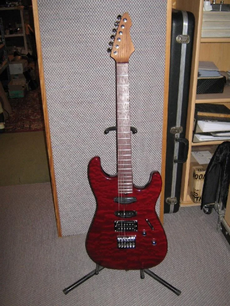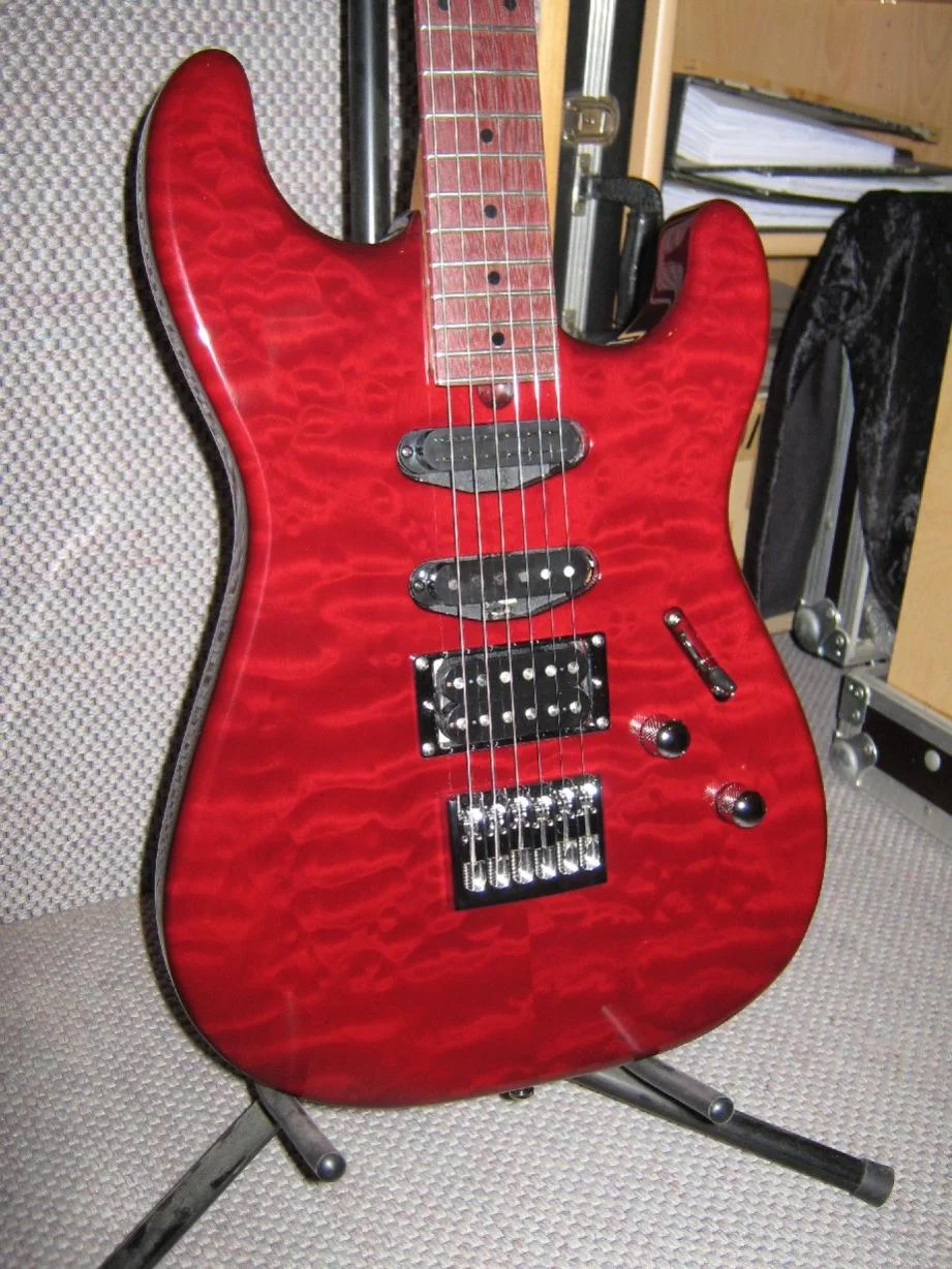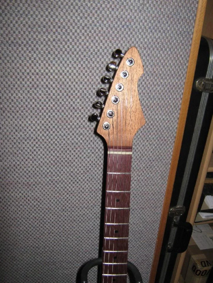 Hallo, Du siehst auch, der Humbucker sitzt etwas anders; ich hatte einmal eine Testgitarre, mit der ich die Positionen von PU's ausprobiert habe. So kommen mehr Obertöne. Und wenn es stört, dann mache ich es anders, nur muß dann der Hals demontiert werden, was manche nicht machen wollen. Da es sich bei den Halsstäben um Doppelwegstäbe handelt, die in beide Richtung wirken, habe ich auf eine Schwächung der Kopfplatte verzichtet.hi Murle... schöööön. Aber wird der StratFanatiker den aufgrund des Trusrodzugang nach hinten gerückte HalsSC nicht stören? Mich stört das brigens eher optisch als tonal! Aber sonst ist sie schlicht schön!
