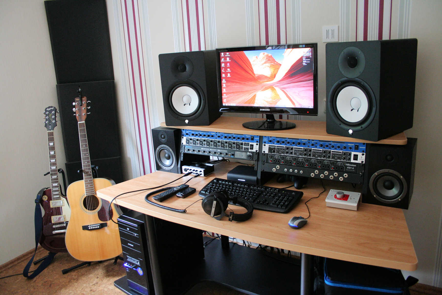 S G K, sieht nett aus. Ich denke allerdings die Akkustik is nich so top oder? Vorallem wenn der Schall der Monitore so halb durch das regal geblockt wird.