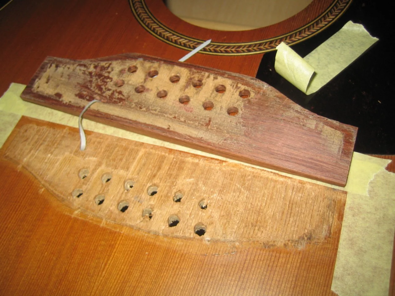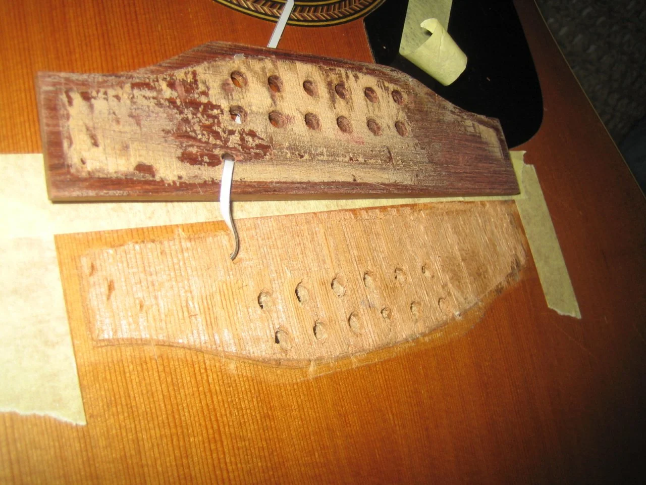 ich habe eine Seagull S12, also eine 12 saitige Westerngitarre. Bei der hat sich der Steg gelöst, ich habe ihn darauf hin entfernt. Leider ist Holz am Steg von der Decke mit ausgerissen, hab die losen Reste vom Steg und auch von der Decke entfern. Nur ist jetzt keine plane, ebene Leimfläche mehr da, ich brauche also einen Fugen füllenden Leim oder Kleber, wer hat das schon mal so erlebt und welcher Kleber ist verwendet worden? Ich hab mal zwei Bilder angehängt. Ich möchte das auf jeden!!! Fall selbst erledigen und keinen Gitarrenbauer aufsuchen.