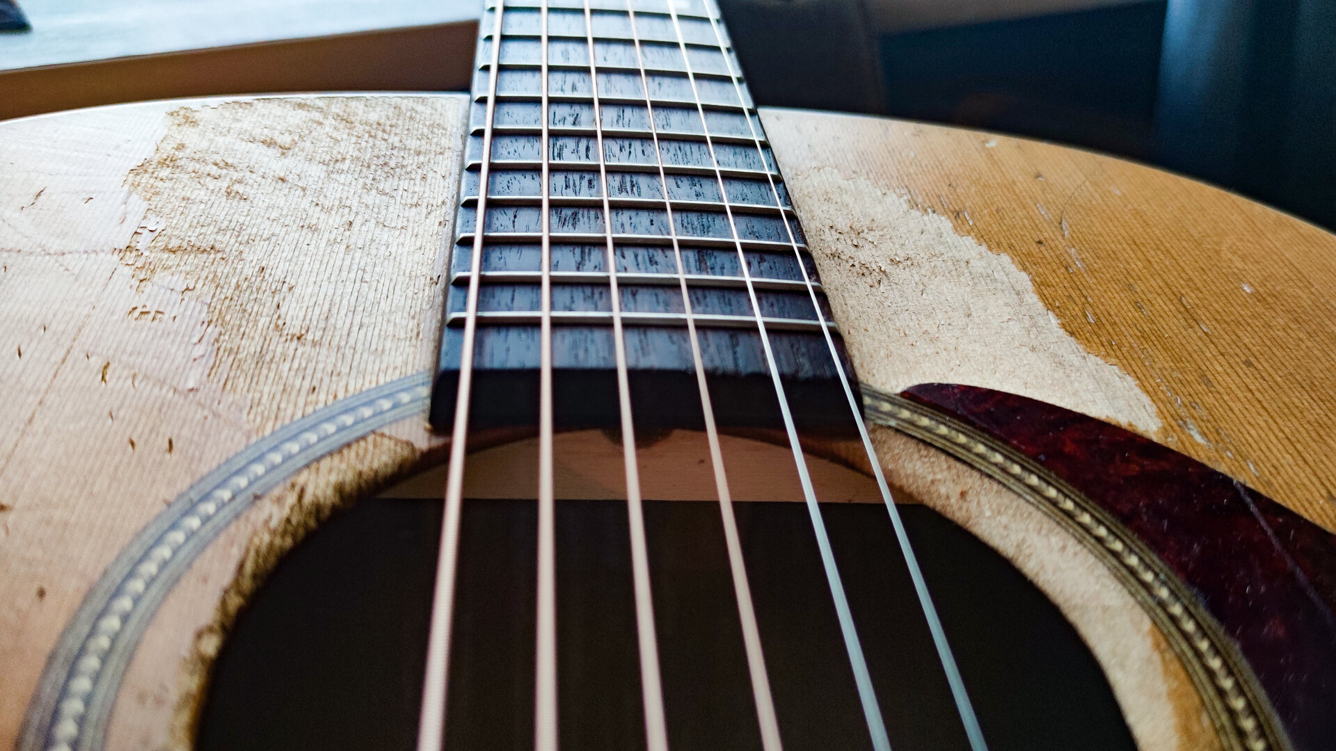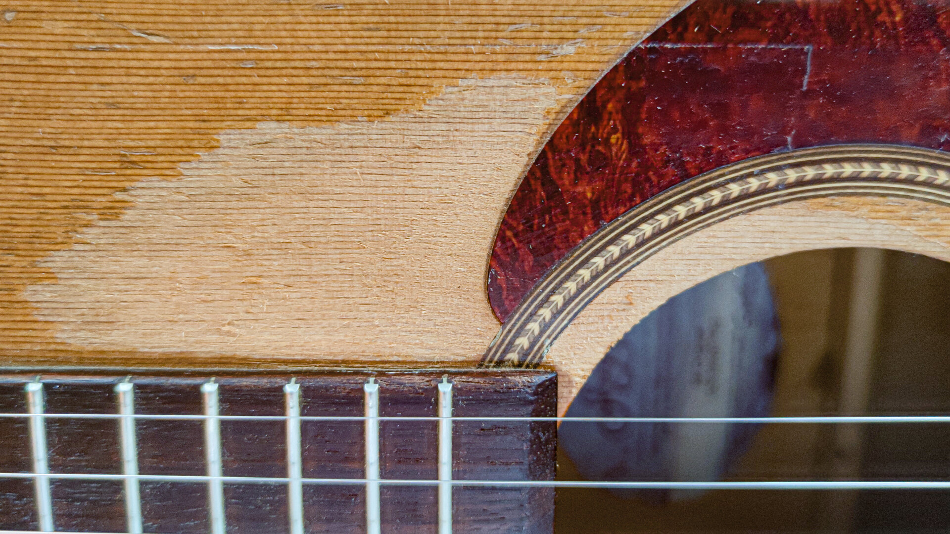 Man sieht es auf den Bildern nur teilweise, jedoch gehen die Schrammen besonders in der Nähe zum Hals schon wirklich arg in die Tiefe, also wird irgendwann wohl Schluss sein mit der strukturellen Integrität. An der dünnsten Stelle bin ich fast durch die Decke.