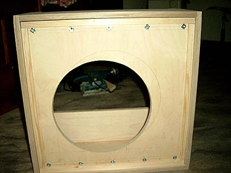 Das Gehäuse wurde per Flachdübelfräse und Holzleim mit Spanngurten montiert. Der Ausschnitt für das Panel grob mit der Stichsäge ausgesägt.