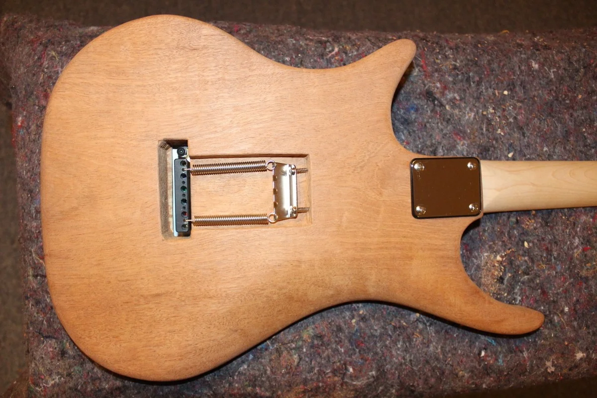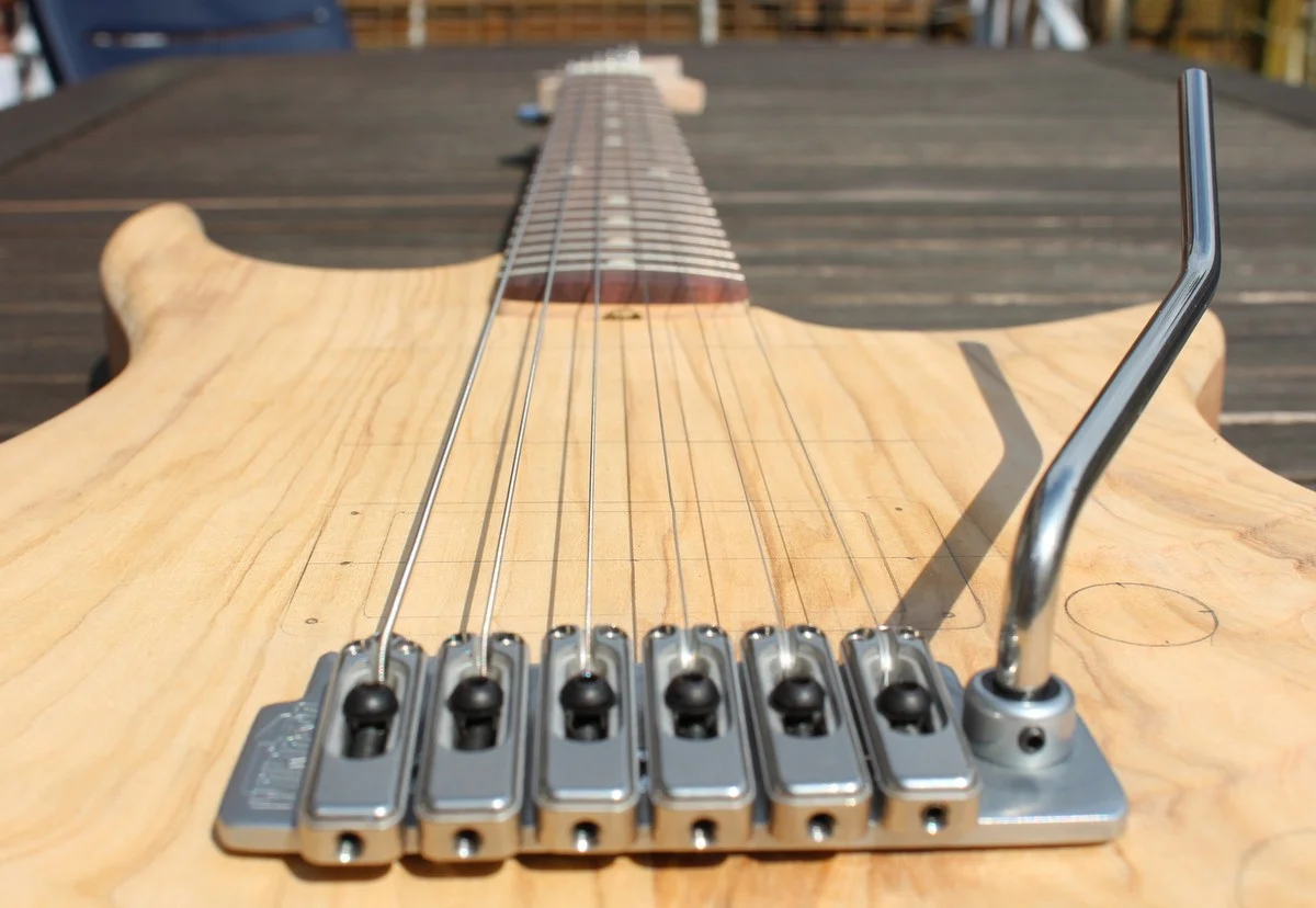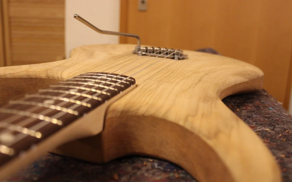 So, weiter geht's: Das Tremolo ist dran und alles scheint zu passen. *Erleichterung* Ich musste zwar den Hals noch etwas tiefer legen, aber ich hatte ja extra etwas Spiel gelassen, nach dem Motto: wegnehmen kann man immer noch, umgekehrt wird's schwieriger. War auch nur ein Millimeter.