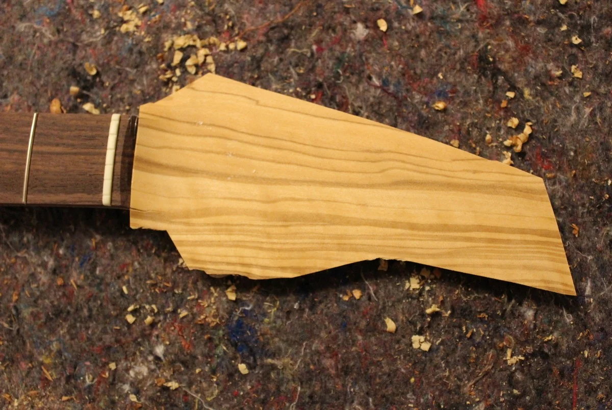 Ich habe mich übrigens entschlossen, die Kopfplatte doch noch zu furnieren. Im Netz habe ich einen Laden gefunden, der auch exotischere Furniere in kleineren Mengen verkauft, unter anderem Olivenholz. Falls jemand mal so was sucht, hier ist der Link: