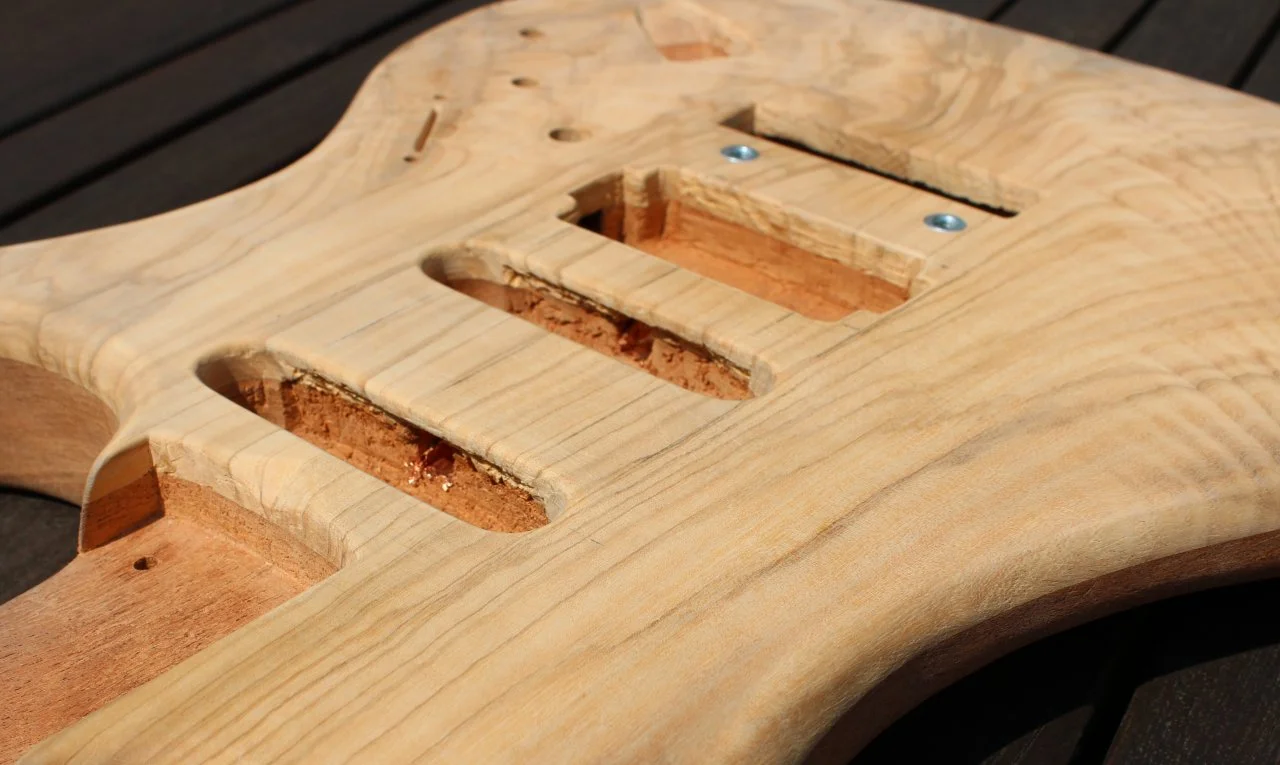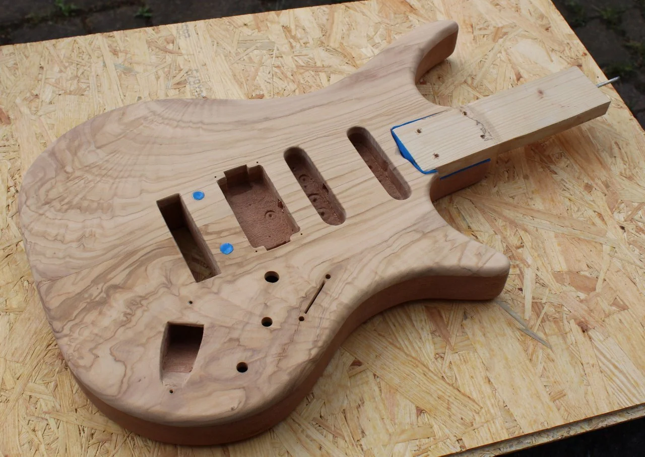 Dann ist der nächste Schritt die Elektrik. Die beiden Fast Track sind schon da und warten auf ihren Einsatz, der Humbucker fehlt noch. Aber erst mal muss ja noch reichlich Holz weg...