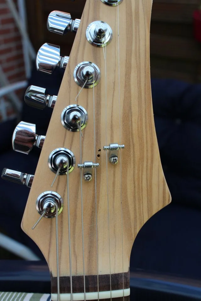 Dann die Saiten zum erstem Mal drauf und probiert. Man kann sie tatsächlich schon spielen, wenn auch noch recht leise ohne PUs... Was soll ich sagen, scheint alles zu passen. Hals ist gerade, Saiten auch, Bundreinheit habe ich schon mal grob justiert, sieht auch gut aus. Seltsamerweise braucht das Tremolo nur zwei Federn, das kommt mir etwas wenig vor. Vielleicht sind die mitgelieferten Federn härter als normal? Na egal, in die Lücke kommt eh' noch 'ne Rockinger Blackbox, ich mag lieber einen festen Anschlagspunkt.