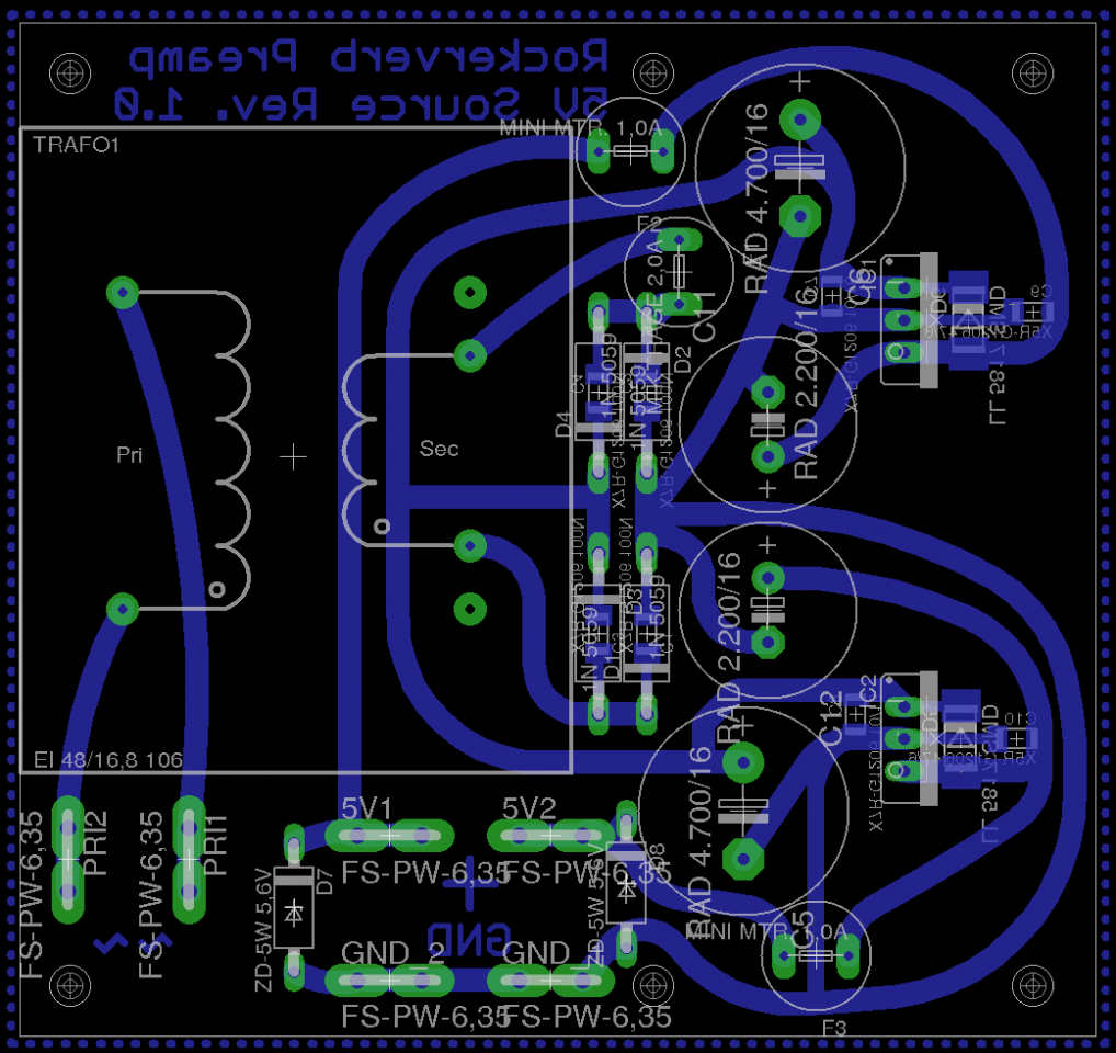 Als wir die Schaltpläne des Rockerverb50 im Netz fanden, kam uns daher die Idee, auf dessen Basis einen Preamp im Rackformat zu bauen, der gegenüber dem "Original" noch ein paar Verbesserungen besitzt und mit einem cleanen Gitarrenamp oder einer PA-Endstufe betrieben werden kann.