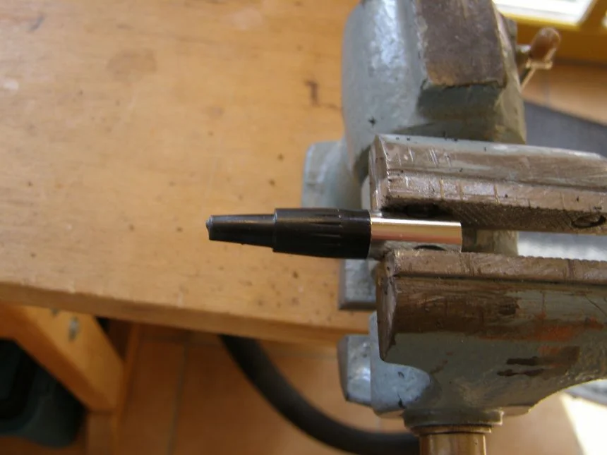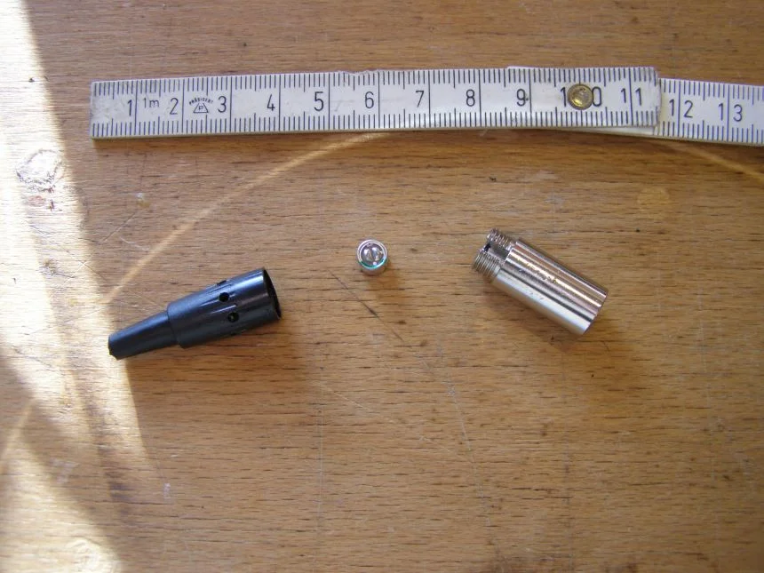 Der übrig gebliebene Stecker wird 'entkernt' so daß nur die leere Hülle übrig bleibt. Dieses Teil wird das Mikrofon-Gehäuse.
