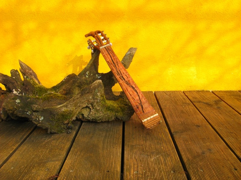 Die Karton-Gitarre habe ich vor einigen Jahren gebaut, um die Klangqualität des Kartons zu testen (sie klingt gar nicht so schlecht).