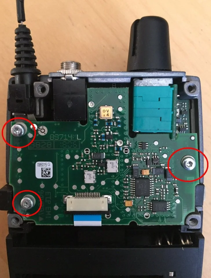 Dort muss man die obenliegende Platine , auf der auch die Antenne sitzt lösen. Das sind drei Schrauben, auch Torx T6, allerdings sind zwei Schrauben von den drei Gewindeschrauben, die unteren beiden, die obere nahe der Antenne ist wie die schon entfernten Schrauben des Deckels keine Gewindeschraube (keine Ahnung, wie man so ein Gewinde bezeichnet). Beim Zusammenbauen später nicht vertauschen!
