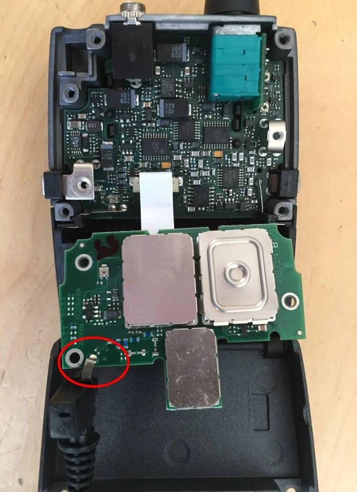 Wenn die drei Schrauben gelöst sind, kann man die Platine mitsamt der Antenne auch nach oben klappen. Dann sieht man, dass sie Antenne lediglich mit einer kurzen Lötfahne an der soeben gelösten Platine befestigt ist. Also Lötkolben angeschmissen - einer mit einer feinen und spitzen Spitze ist angesagt. Die Lötfahne der Antenne geht einfach heraus, die neue Antenne sollte man natürlich in der selben Position anlöten, so dass auch hinterher keine Spannung entsteht und der Lötpunkt sich wieder löst. Hier muss man schauen, da die Lötfahne leicht schief an der Antenne sitzt. Man kann natürlich den Lötpunkt auch hinterher wieder setzen, wenn die Antenne in der Halterung sitzt und die Platine wieder mit der oder den Schrauben fixiert ist. Bei mir funktionierte das so ganz gut, und die Antenne saß ohne Spannung in der Halterung.Nun wieder die drei Schrauben der Platine befestigt, vorsichtig den Deckel wieder zugeklappt, sowie die vier rückseitigen Schrauben wieder reingedreht, Halteklipp ran, Batterien eingelegt - fertig.