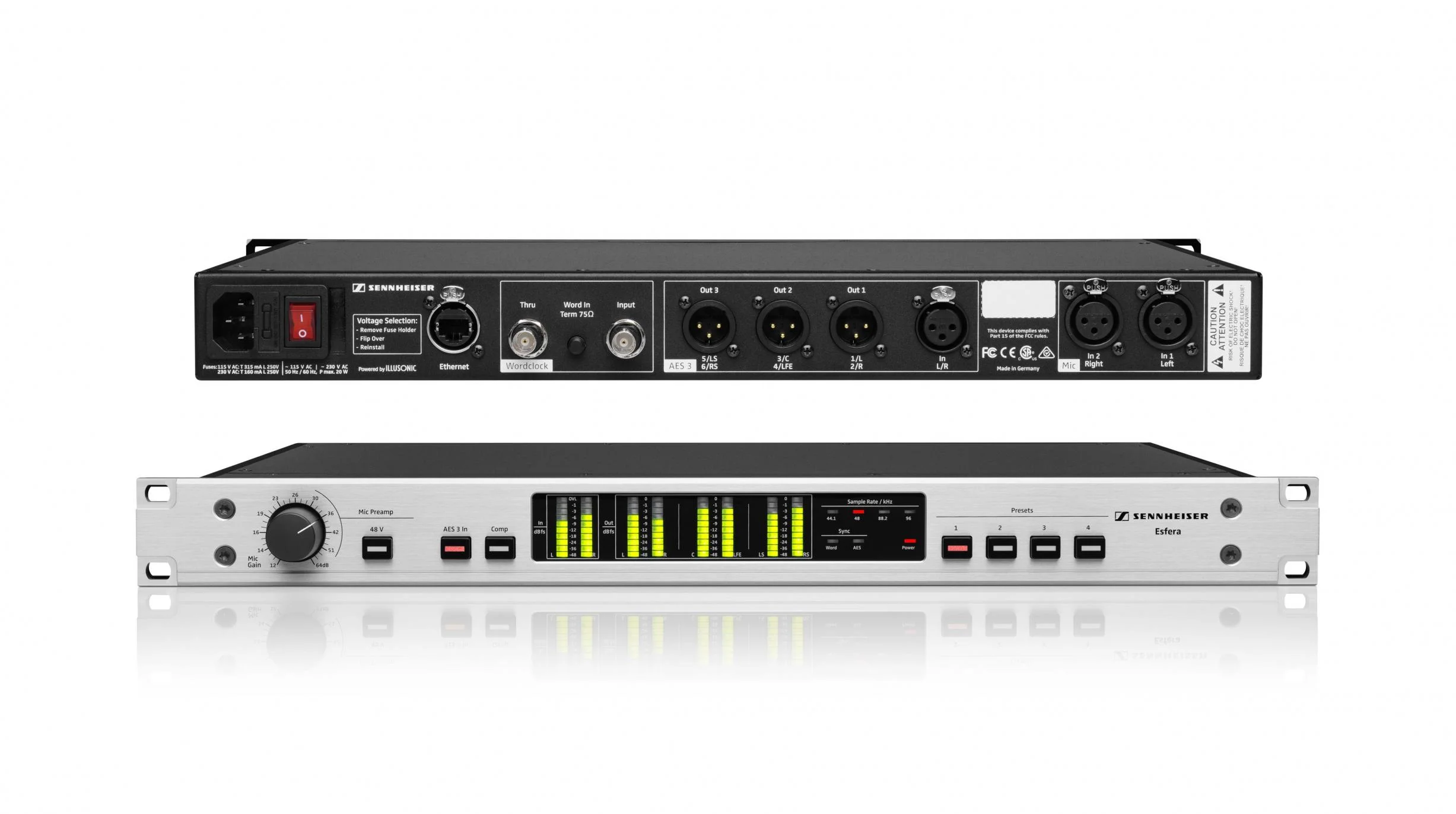 Esfera Die Basiseinheit SBP 8000Die 19-Zoll-Prozessoreinheit von Esfera erzeugt über einen speziellen Algorithmus aus den Mikrofonsignalen ein vollständiges 5.1-Surround-Signal mit Sampling-Raten von bis zu 96 kHz. Ein eingebauter Kompressor sorgt für ein sendefreundliches Signal.