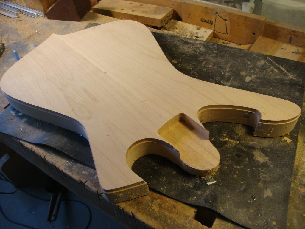Damit wäre schonmal ein Problem gelöst. Wie man auf den Bildern sieht, ist der Korpus auch schon ausgesägt. Das Holz ist diesmal besonders leichte Erle (bei der FireDan I war es Linde mit einer Ahorndecke).