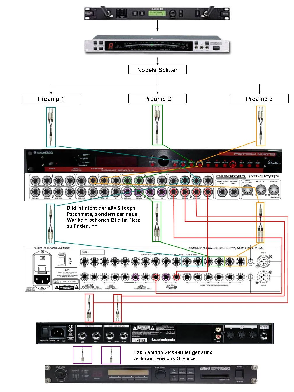 Von dort in einen Nobels Splitter, der mein Gitarrensignal in 4 Signale splittet. Mit 3en gehe ich jeweils in die Pre-amp. deren Ausgänge gehen einmal auf in das Patchmate und auf den Samson.