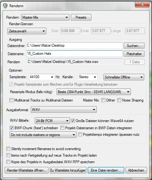 Ich hab ein Problem, und zwar habe ich einen Track in Reaper aufgenommen abgemischt (2 Gitarrenspuren, 1 Drumspur). Spiele ich es in Reaper ab, habe ich einen fetten, lauten, raumreichen Klang. Alles stimmt! Wenn ich es nun rendere und abspiele habe ich sehr leisen, matschigen Sound, unabhängig vom Format. Habs mit mp3 (192), ogg, wav probiert, das tut sich nicht viel. Ich habe den Master auch so ausgepegelt, daß es gerade nicht verzerrt. Der Pegel steht kurz vor Maximum.