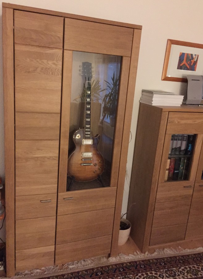 Statt der Bücher könnte man in dem Schrank rechts auch ein schicken kleinen Amp rein stellen...oder eine Ukulele. Je nach Vorlieben.
