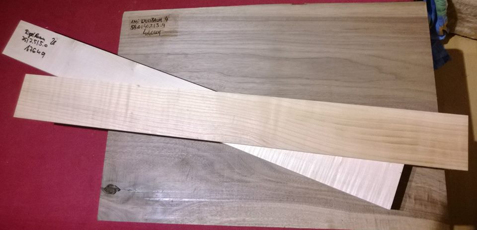 Deswegen verwende ich für den Korpus Nuss, Ahorn für den Hals und Kirsche für's Griffbrett.
