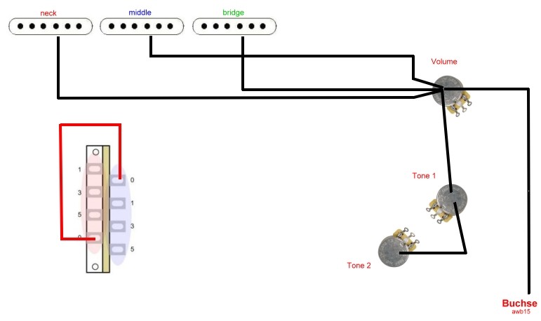 Pos. 4 wirkt auf eine Coil des HB, regelbar mit Tone, auf Middle- und Neck-PU nicht, weil die zweite HB-Coil entkoppelnd wirkt. Wenn ich diesen per Split-Schalter ausschalte, sollte der Bass-Cut auf alle PU wirken, und er ist über Tone regelbar.