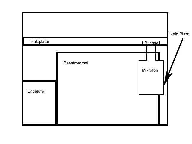 Das eigentliche Problemkind ist der Bassbereich. Hier habe ich nämlich überhaupt gar keinen Platz zwischen Trommel und Gitter, als das dort ein Mic reinpassen würde. Deshalb wäre es total praktisch, wenn ich dort eine XLR-Buchse anbringen könnte. Ich spare mir jetzt vielerlei Worte und bitte euch, einfach mal auf meine gnadenlos gute Skizze zu schauen 🙂 Dort ist das ganz gut zu erkennen.